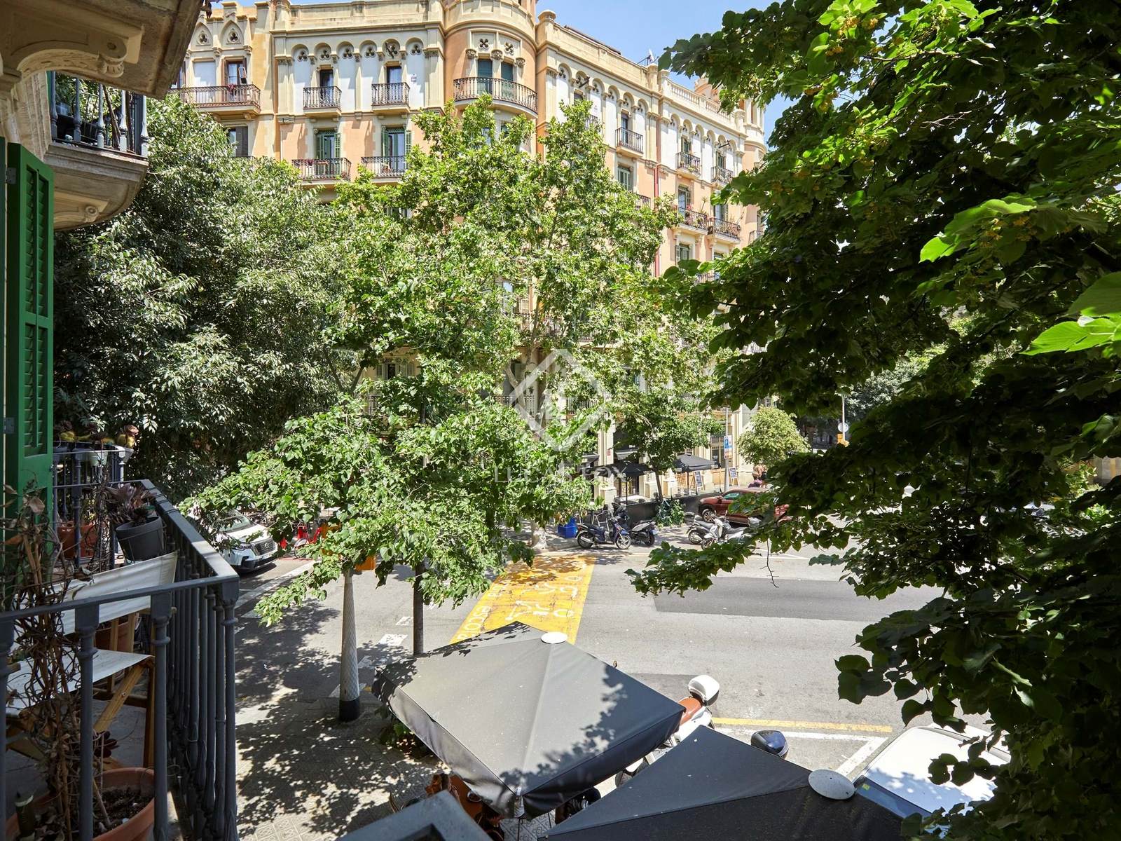 Elegant hörnlägenhet med 3 sovrum och 2 badrum i en byggnad från 1900-talet med högt i tak, originallister, parkettgolv, öppet kök, fyra balkonger, en 9 m² stor terrass och en gemensam terrass. Helrenoverad, ljus och bara några steg från Passeig de Gracia.