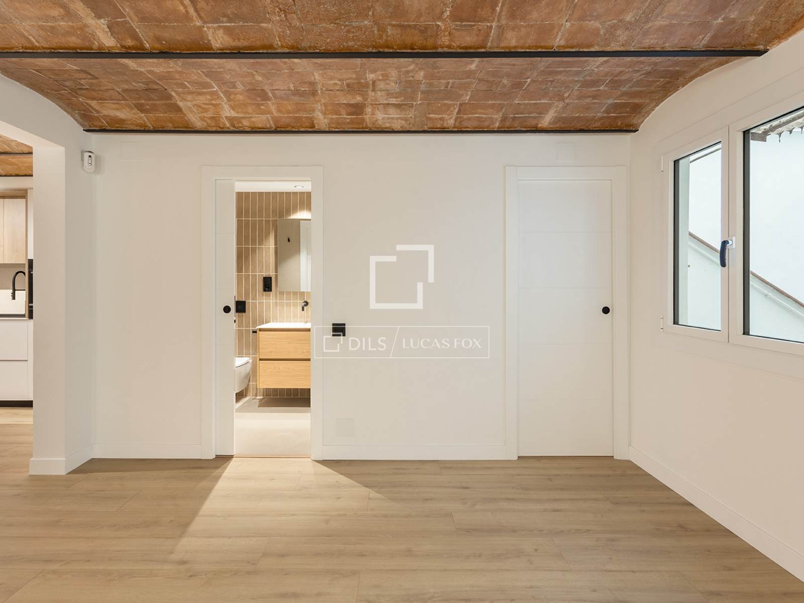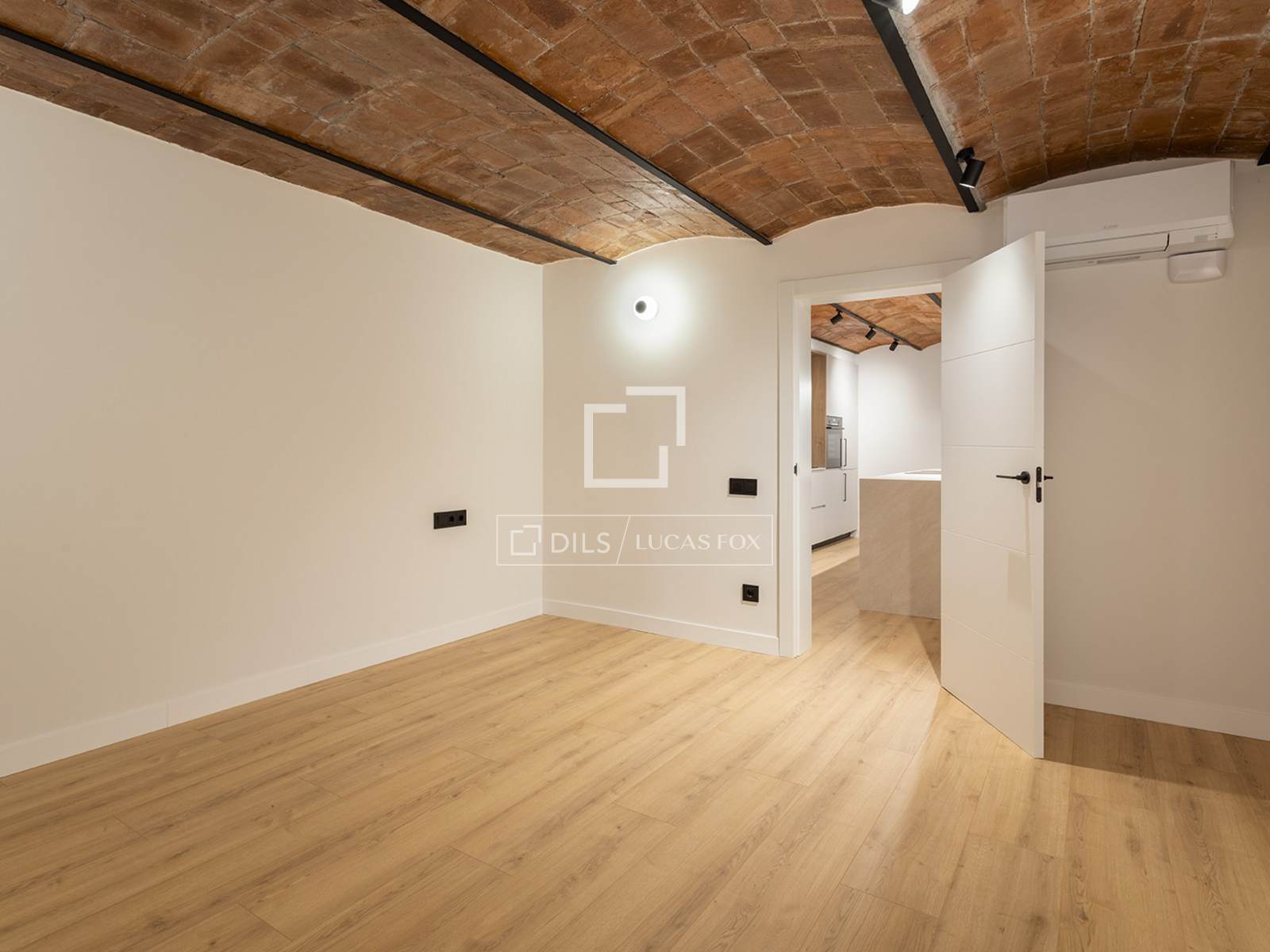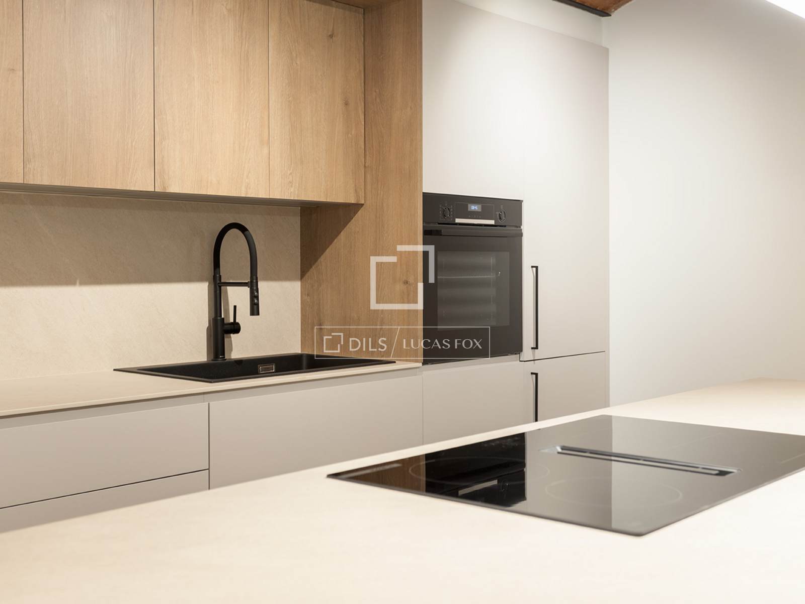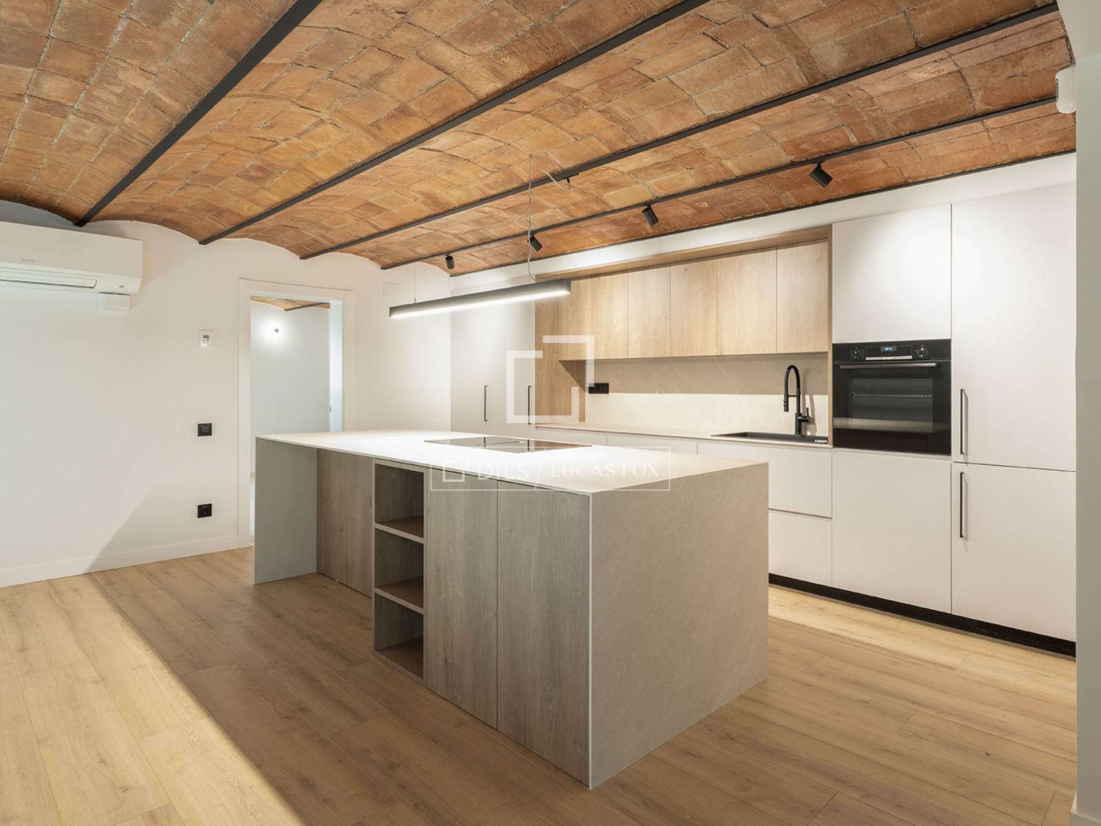 Lägenhetens hjärta är det moderna, praktiska och fullt utrustade köket, öppet mot vardagsrummet och med en stor köksö som inbjuder till matlagning och umgänge. De synliga katalanska välvda taken ger karaktär och en unik historisk charm, vilket ytterligare förstärks av parkettgolv och en varm och elegant inredning.
