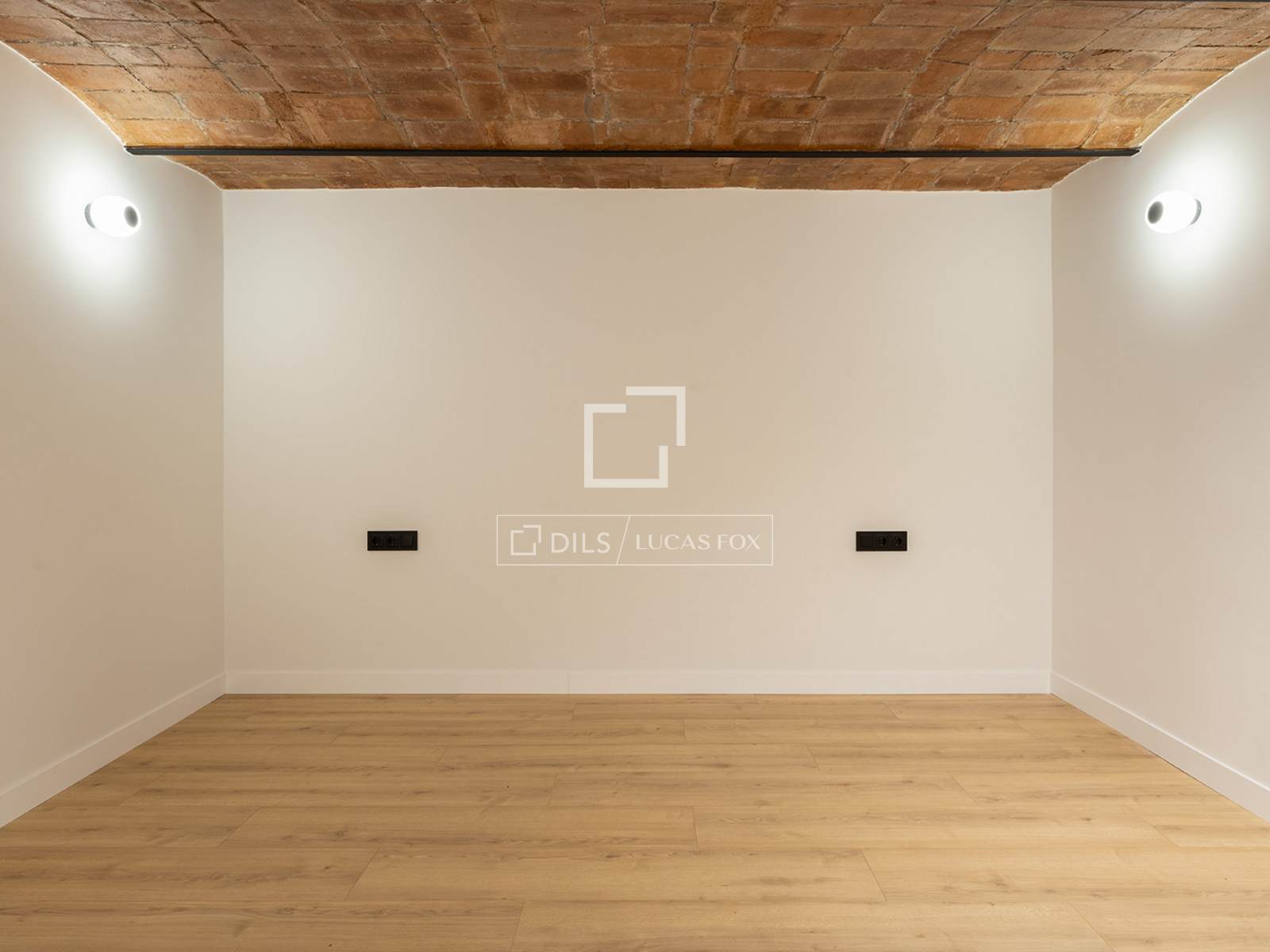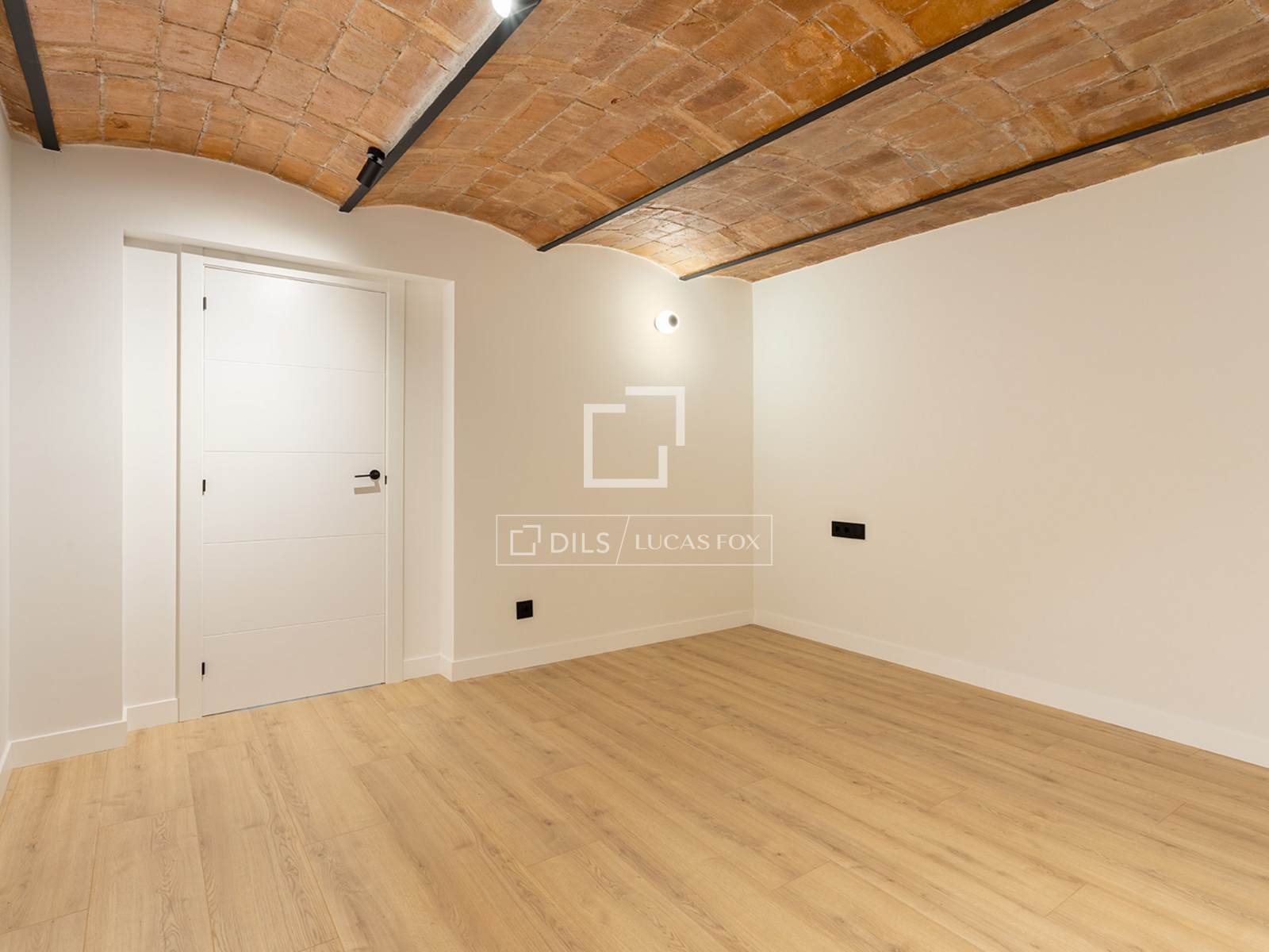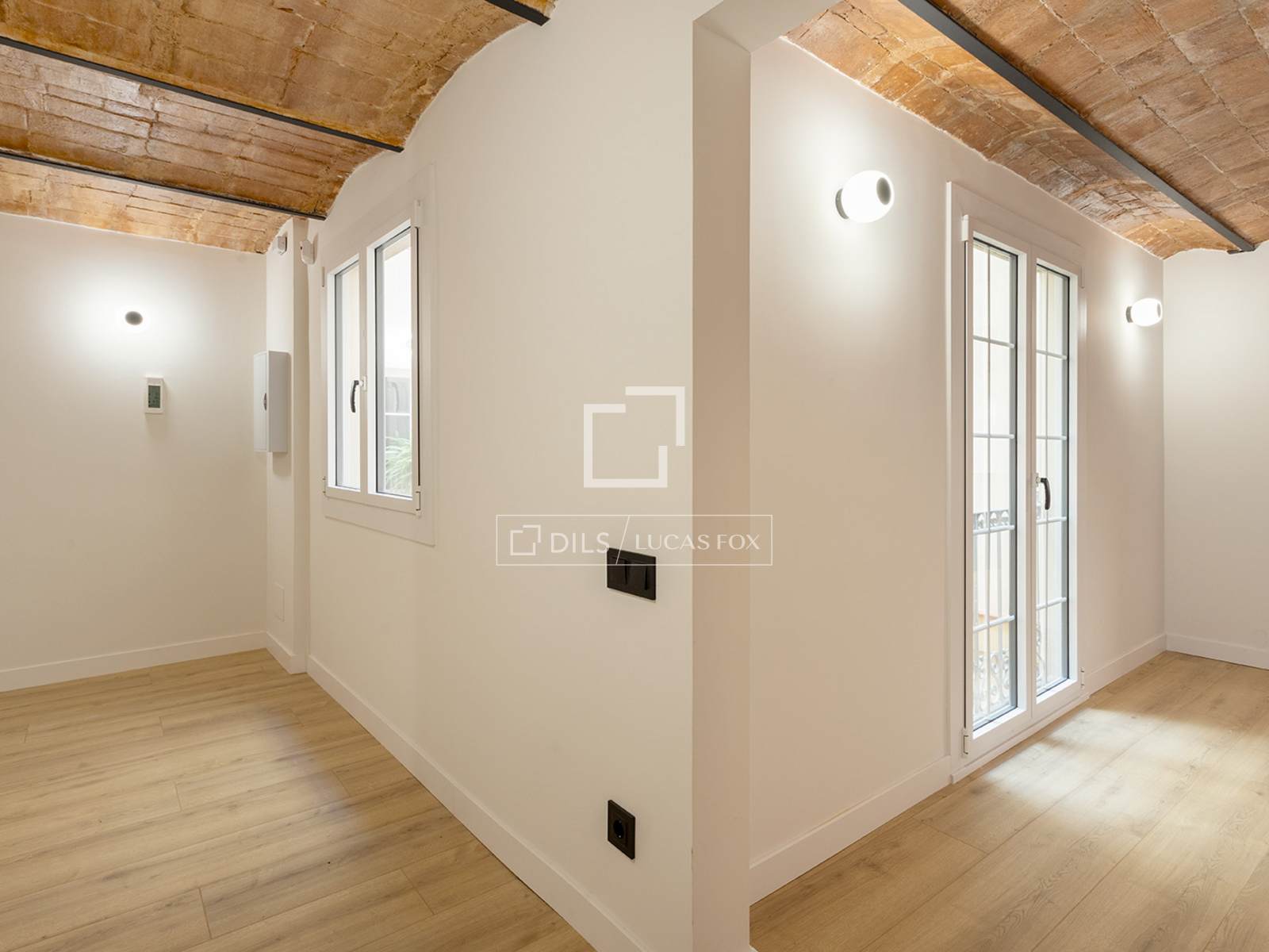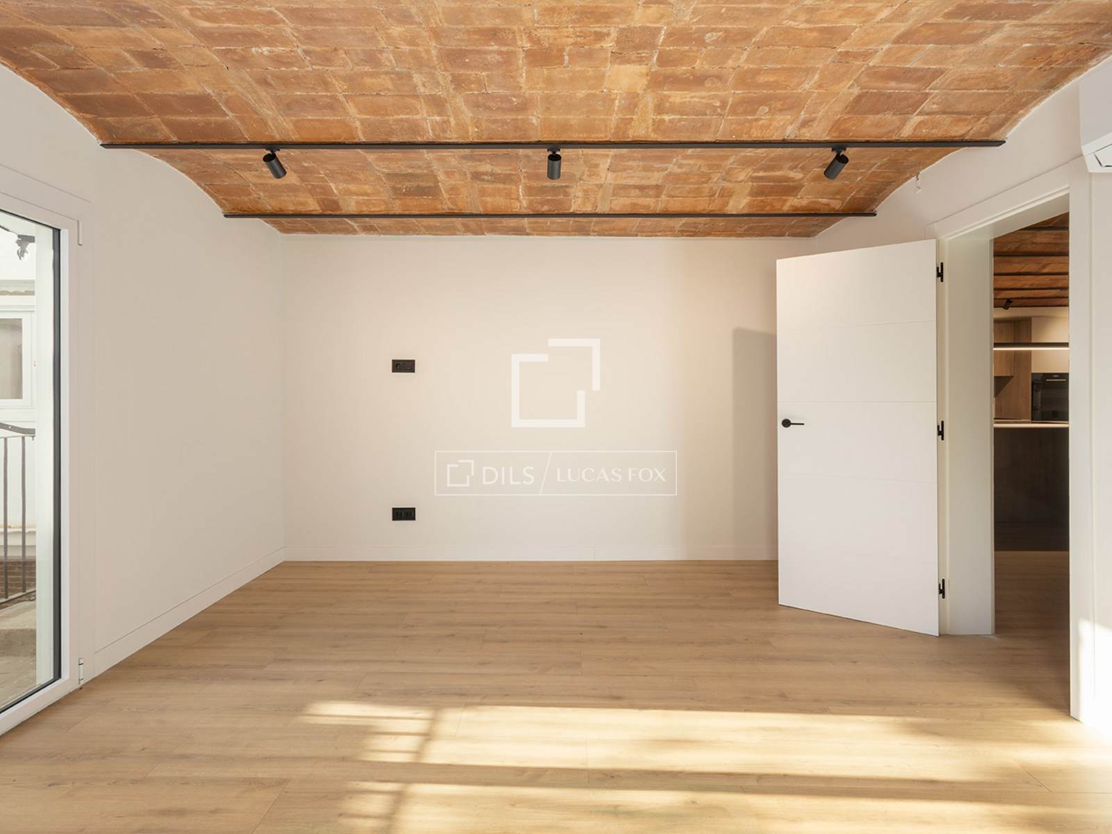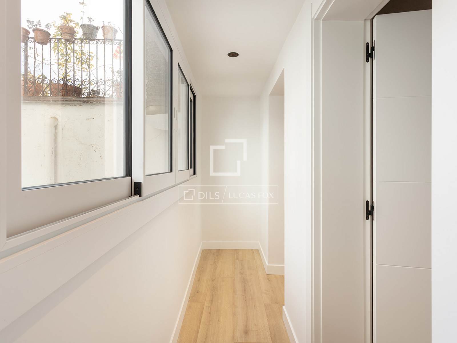 Lägenhetens hjärta är det moderna, praktiska och fullt utrustade köket, öppet mot vardagsrummet och med en stor köksö som inbjuder till matlagning och umgänge. De synliga katalanska välvda taken ger karaktär och en unik historisk charm, vilket ytterligare förstärks av parkettgolv och en varm och elegant inredning.