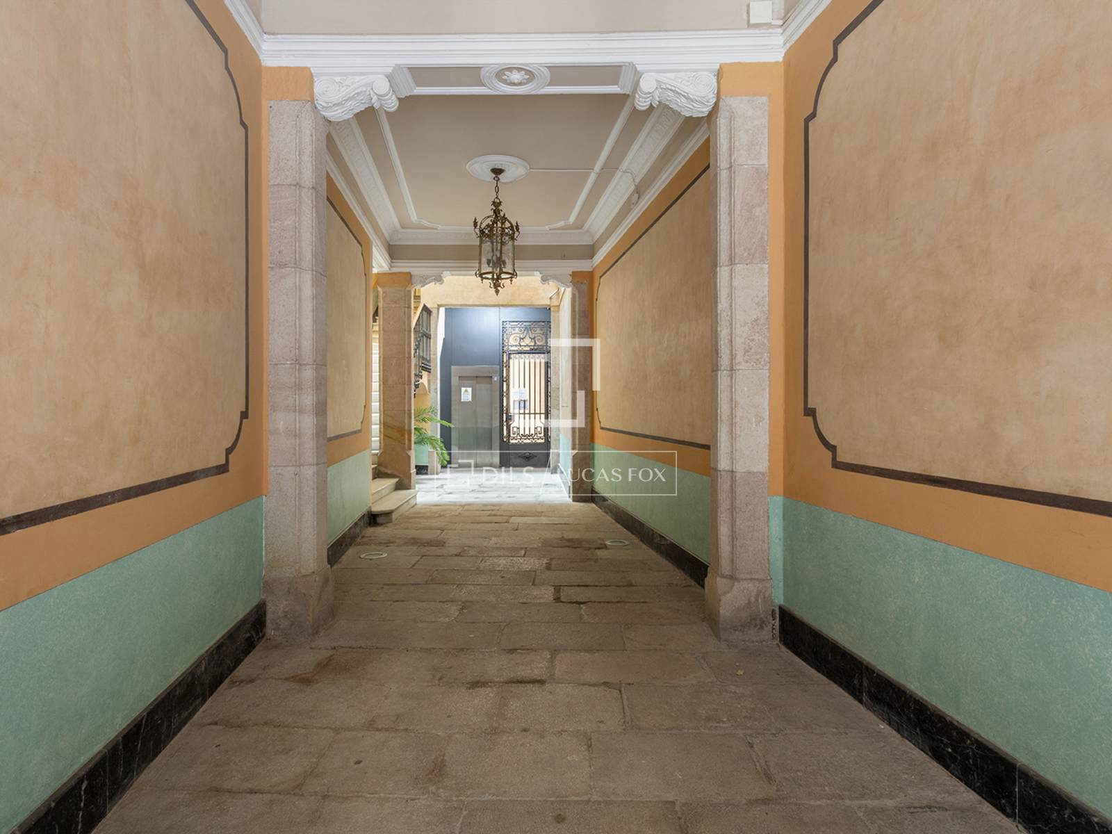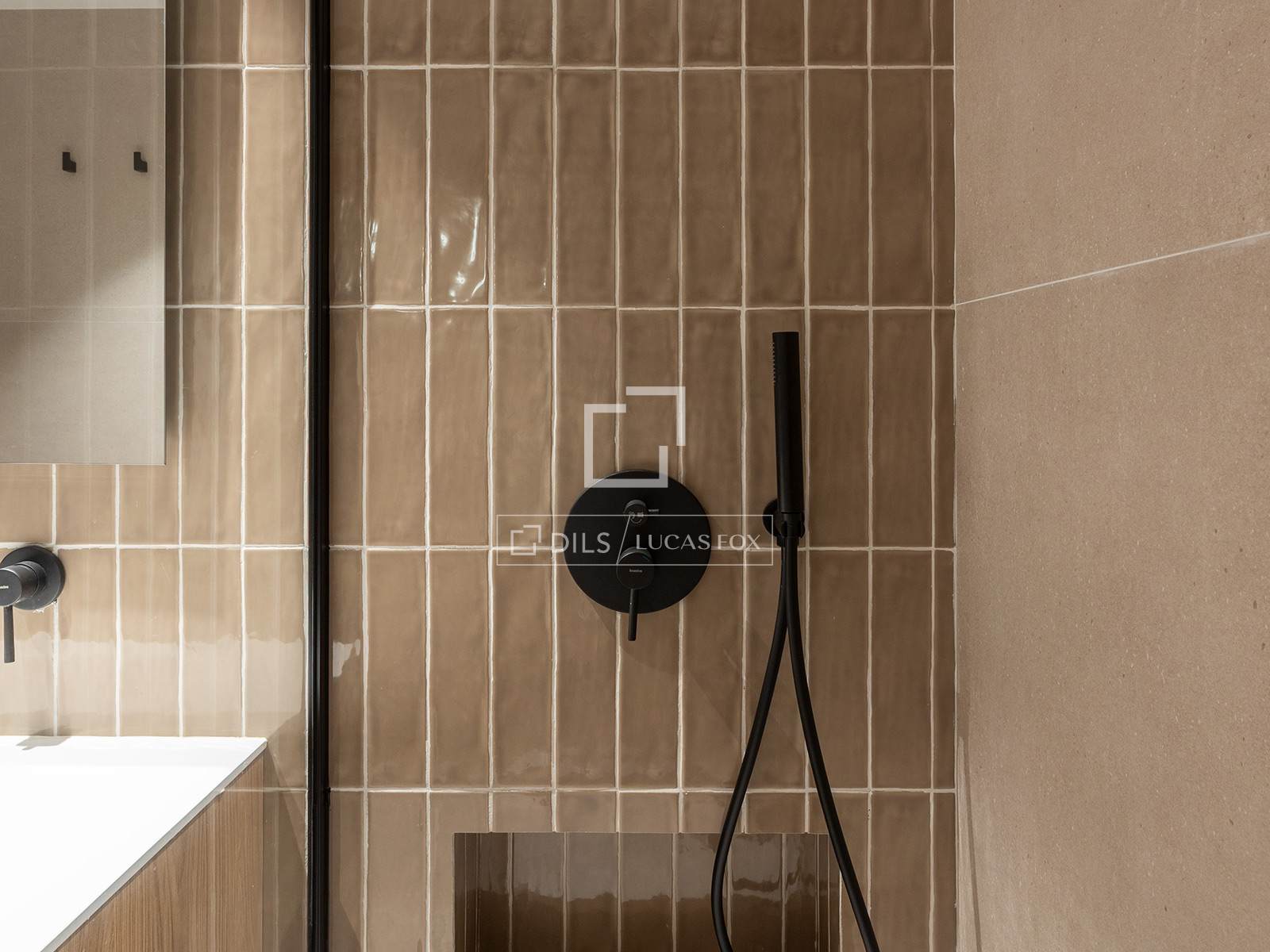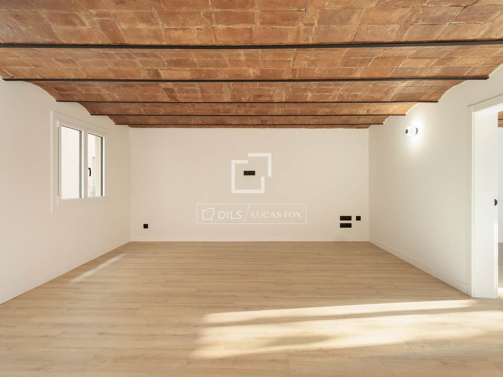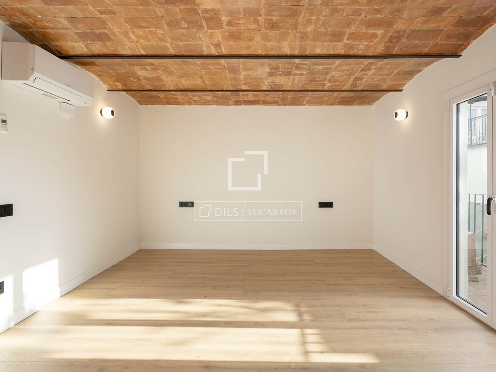 Lägenhetens hjärta är det moderna, praktiska och fullt utrustade köket, öppet mot vardagsrummet och med en stor köksö som inbjuder till matlagning och umgänge. De synliga katalanska välvda taken ger karaktär och en unik historisk charm, vilket ytterligare förstärks av parkettgolv och en varm och elegant inredning.