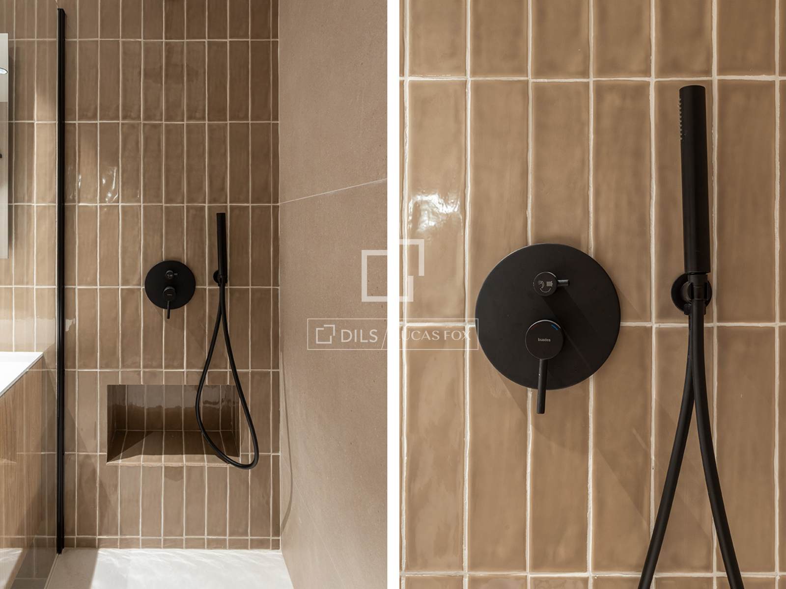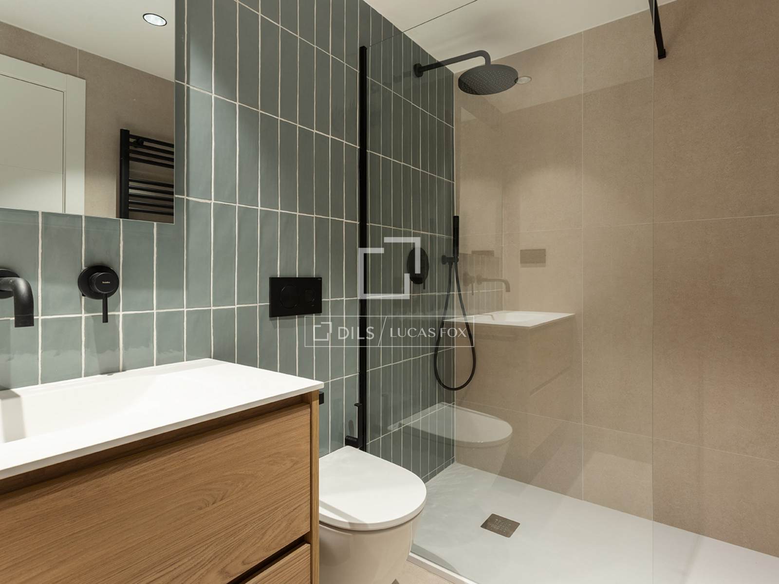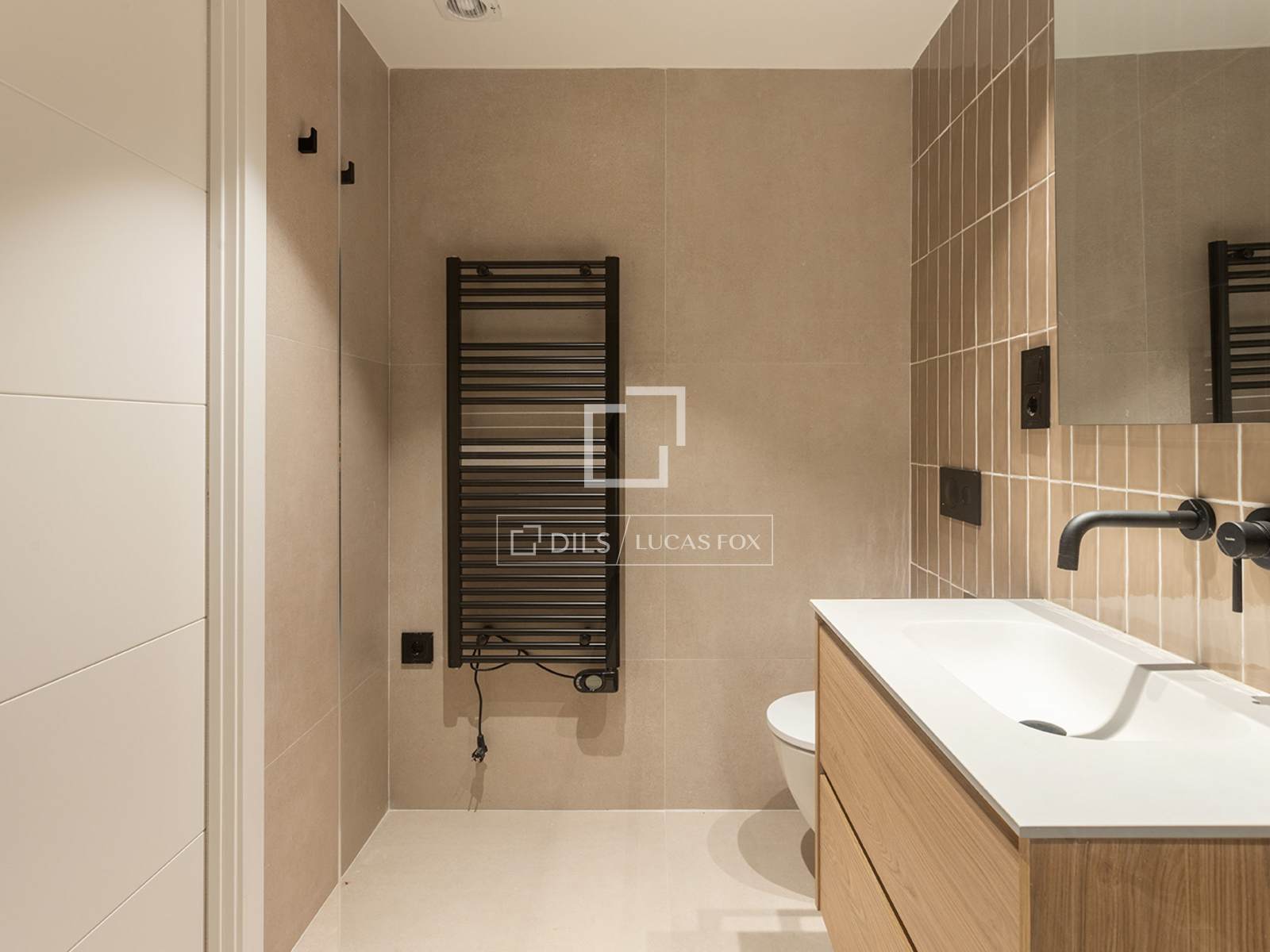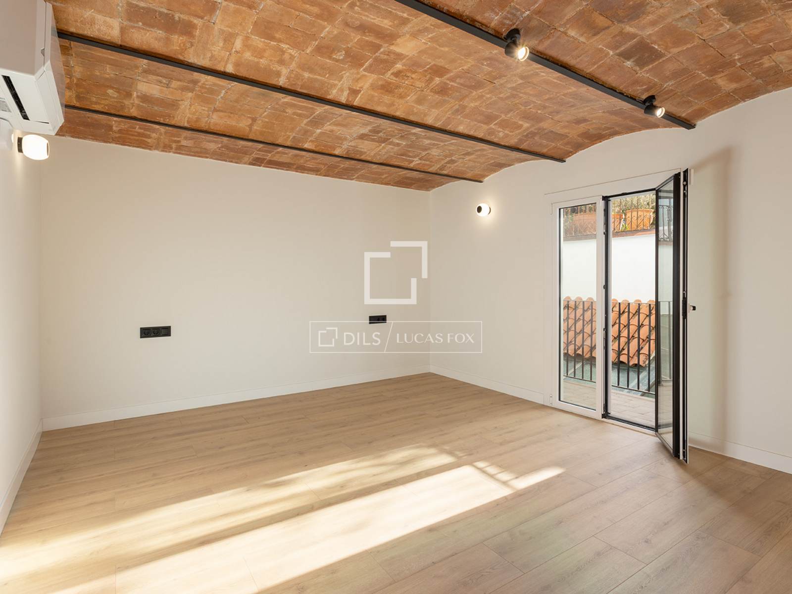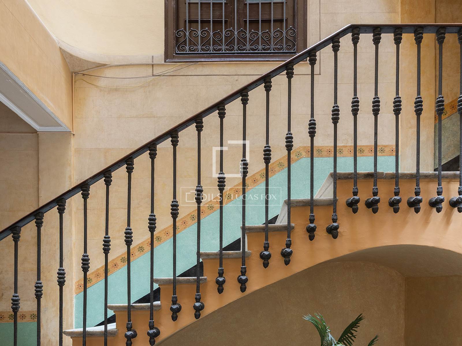 Lägenhetens hjärta är det moderna, praktiska och fullt utrustade köket, öppet mot vardagsrummet och med en stor köksö som inbjuder till matlagning och umgänge. De synliga katalanska välvda taken ger karaktär och en unik historisk charm, vilket ytterligare förstärks av parkettgolv och en varm och elegant inredning.