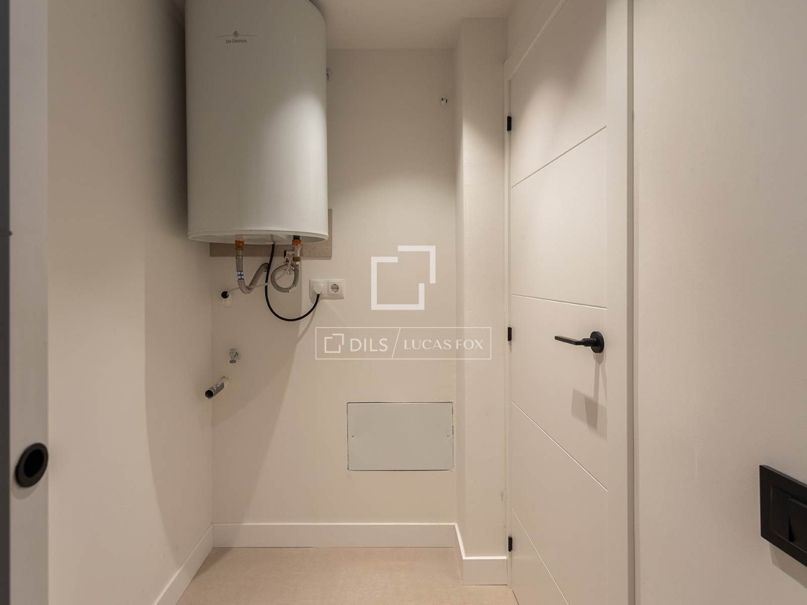 Lägenheten inkluderar ett tvättstuga och ett extra förråd, skapat genom att en gammal trappa som tidigare var ansluten till byggnadens bottenvåning, nu nedlagd, har omvandlats. Båda sovrummen har tillgång till en liten balkong.