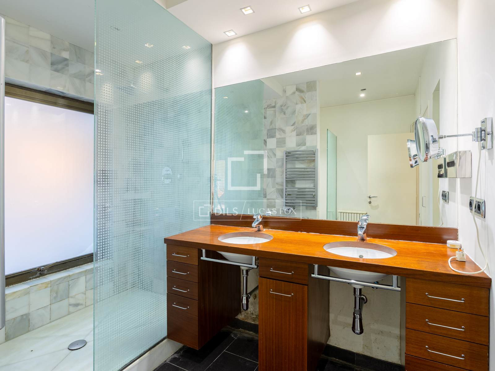 Tillbaka till huvudentrén hittar vi gästtoaletten och, till höger, sovrumsdelen, som inkluderar tre sovrum med inbyggda garderober, ett komplett badrum och huvudsovrummet, som har en klädkammare och eget badrum, med direkt tillgång till trädgården. Alla rum har utvändiga fönster.