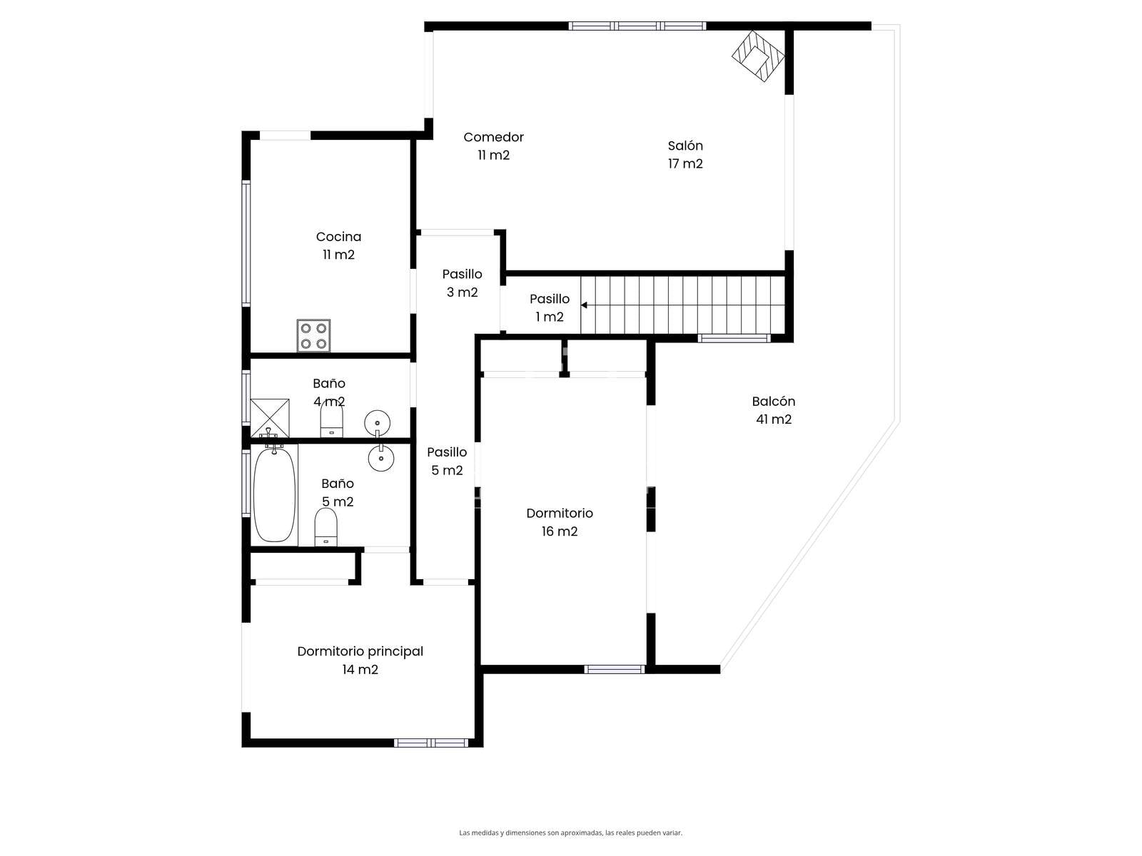 Från huvudentrén är huset fördelat över olika utrymmen. På denna våning finns två sovrum med dubbelsäng, ett komplett badrum och ett mångsidigt rum som är idealiskt som ett avkopplingsutrymme eller fritidsrum.