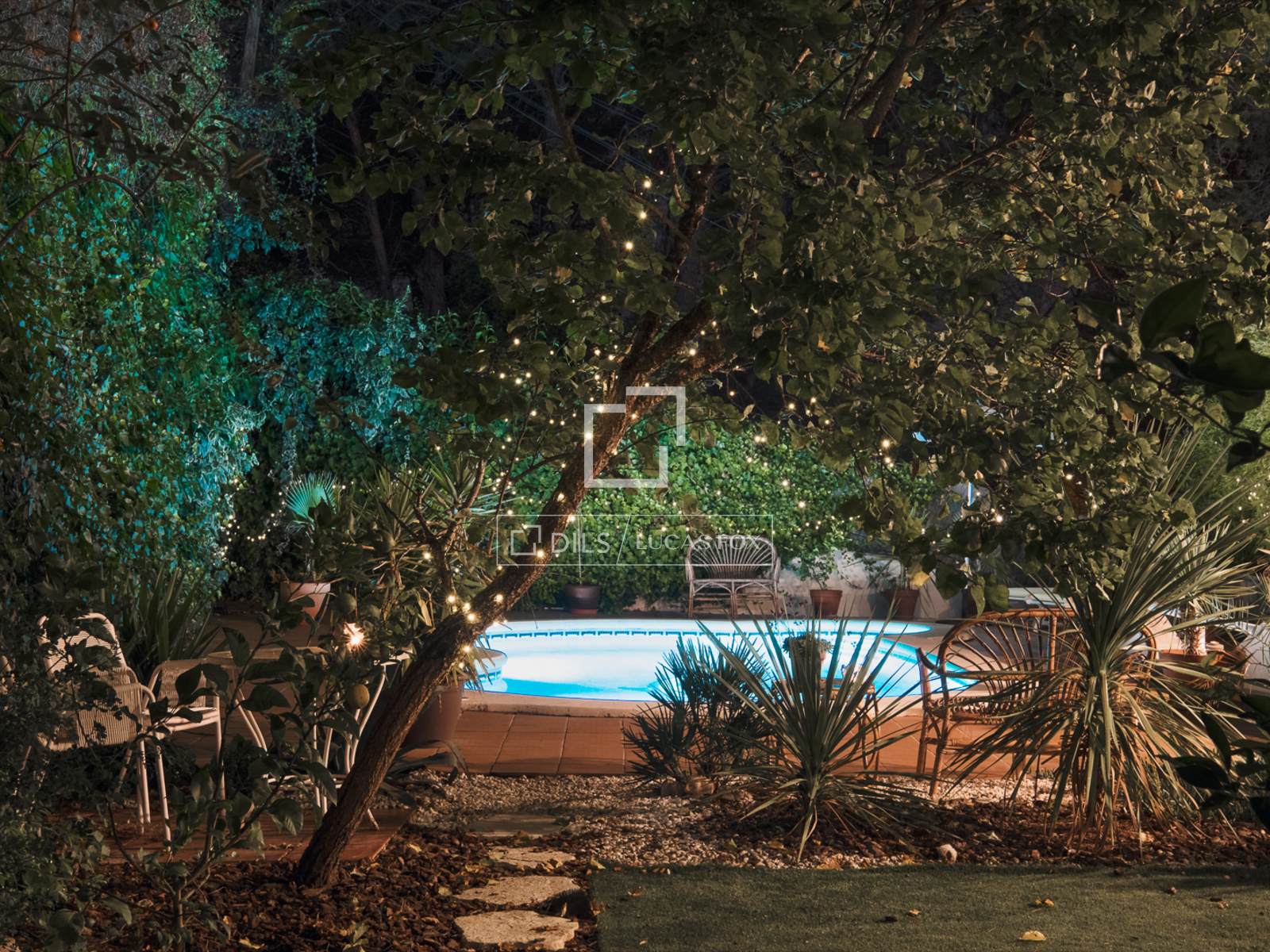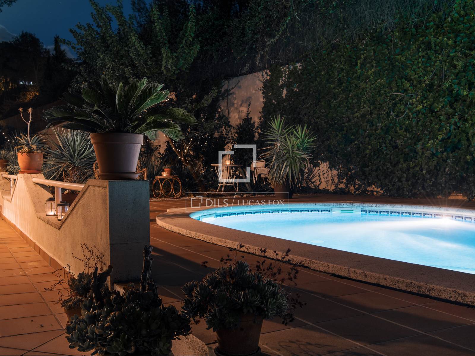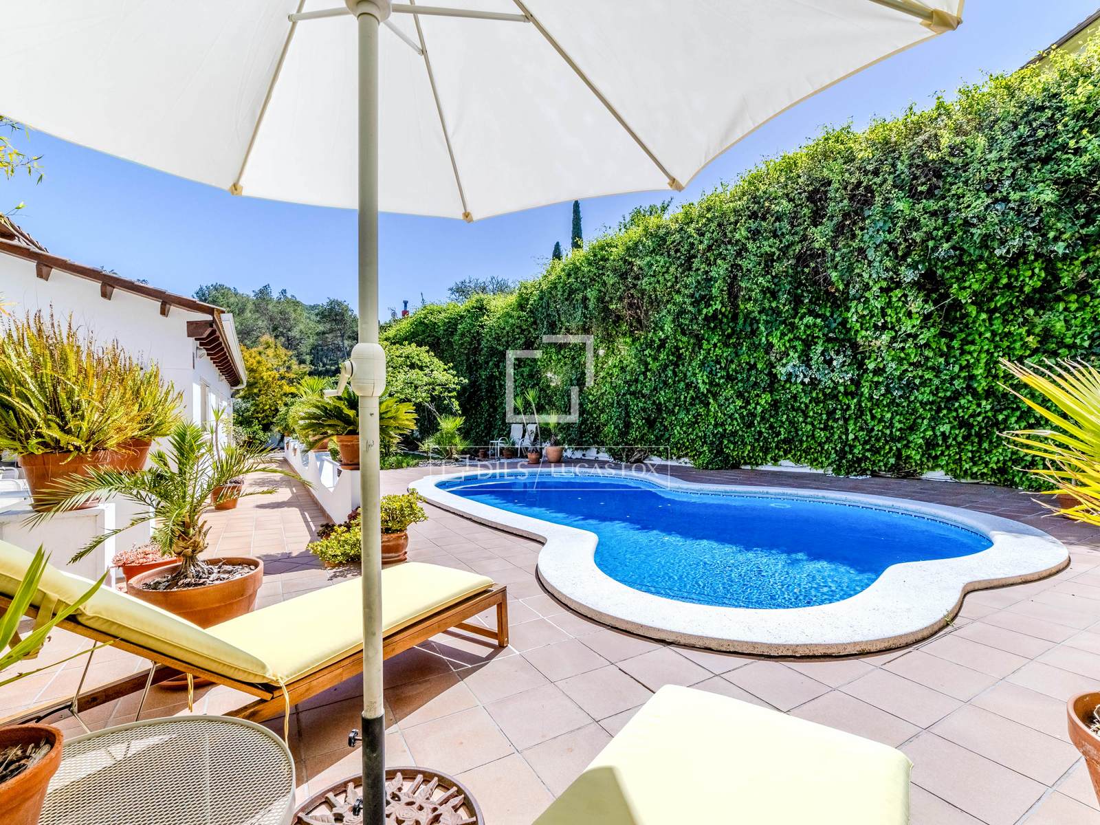 Utomhus omges fastigheten av en privat trädgård som garanterar lugn och avskildhet. Vardagsrummet öppnar sig direkt mot utomhusområdena, som inkluderar en pool, en uteplats och flera sittgrupper utformade för året runt-njutning. Fastigheten erbjuder också en utomhusparkering, väl integrerad i trädgårdsmiljön.