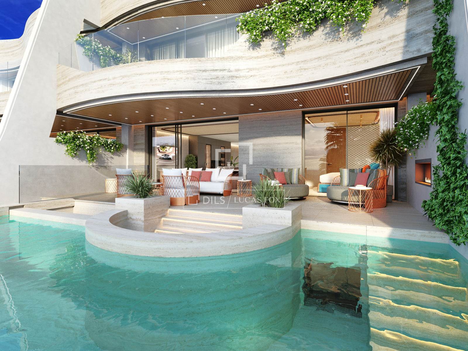 Lägenheten erbjuder rymliga sovrum med eget badrum, öppen planlösning och en sömlös anslutning till den naturliga omgivningen tack vare stora panoramafönster som öppnar upp mot en omsorgsfullt anlagd privat trädgård. Dess pool, som också är integrerad i detta trädgårdsområde, ger en oöverträffad nivå av avskildhet och välbefinnande, vilket höjer boendeupplevelsen till en exceptionell standard.