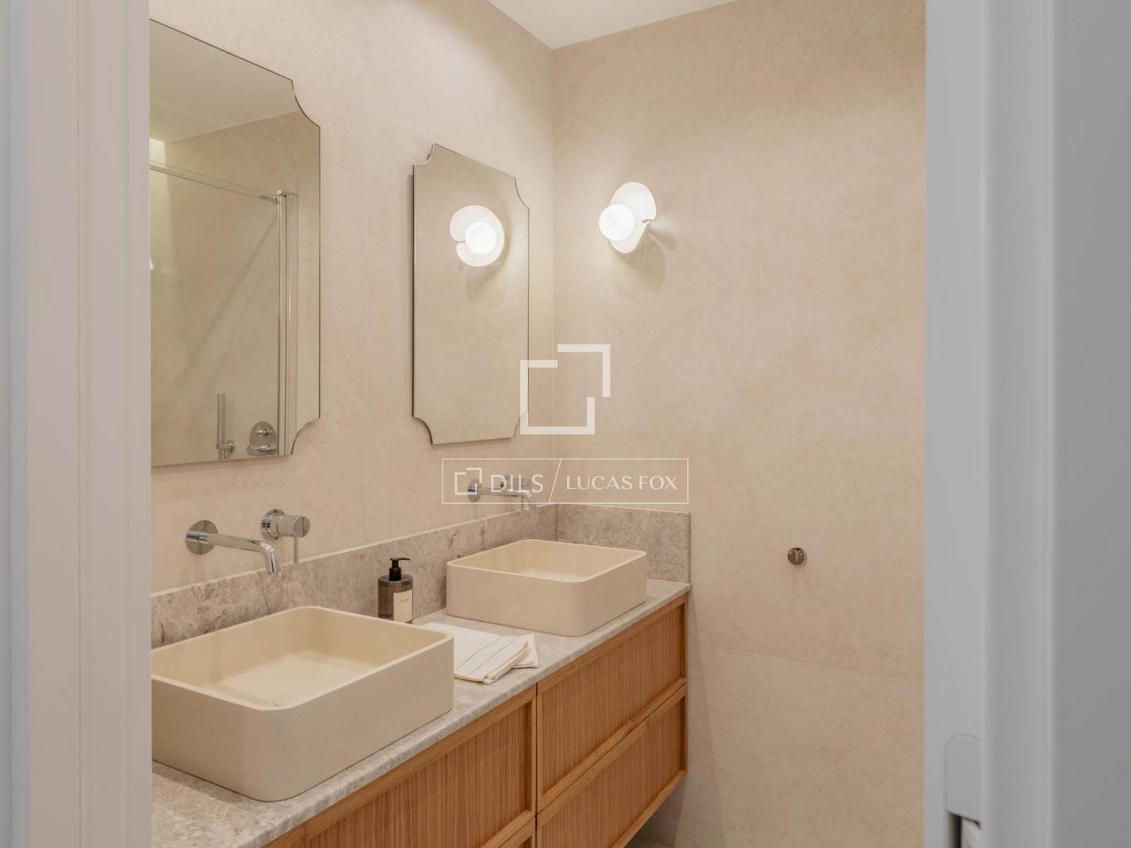 Det privata utrymmet består av två sovrum. Det stora sovrummet har ett eget badrum och specialbyggda garderober, vilket erbjuder en lugn och bekväm atmosfär. Det andra sovrummet, också med inbyggda garderober, har ett eget badrum, vilket gör det idealiskt som ett andra sovrum eller gästrum. Fastigheten kompletteras av ett tredje badrum, som fungerar som gästtoalett och ger extra utrymme för de sociala utrymmena. Planlösningen är mycket väl genomtänkt, utformad för att maximera naturligt ljus, komfort och utnyttjande av varje kvadratmeter.