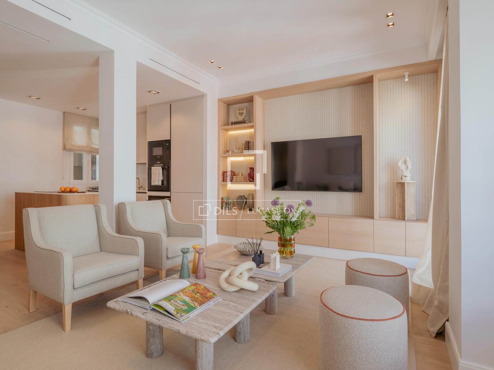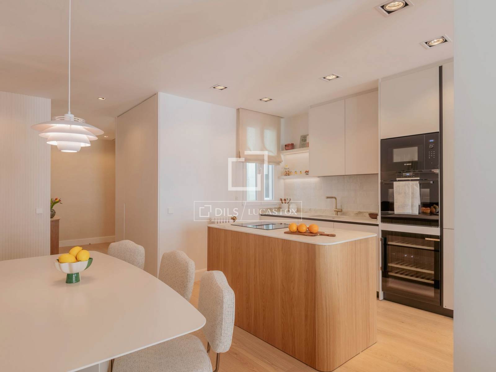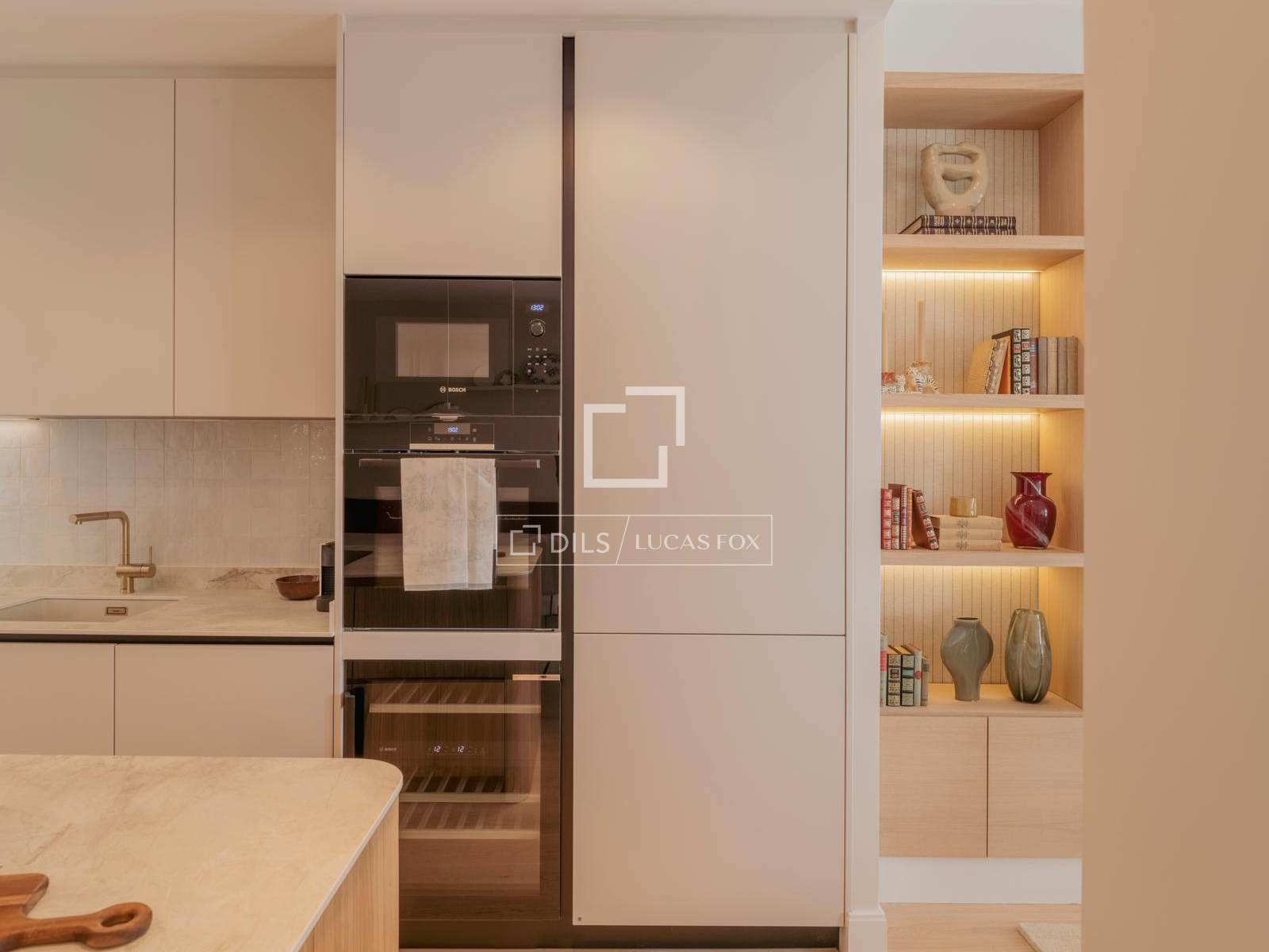 Bostaden är organiserad kring ett rymligt och ljust sällskapsutrymme, där vardagsrum, matsal och kök flyter sömlöst samman till ett balanserat och harmoniskt utrymme. Det specialdesignade köket integreras naturligt i den övergripande designen, vilket tillför både funktionalitet och estetik, och öppnar sig mot vardagsrummet, vilket skapar en idealisk miljö för både vardagsbruk och underhållning av gäster.