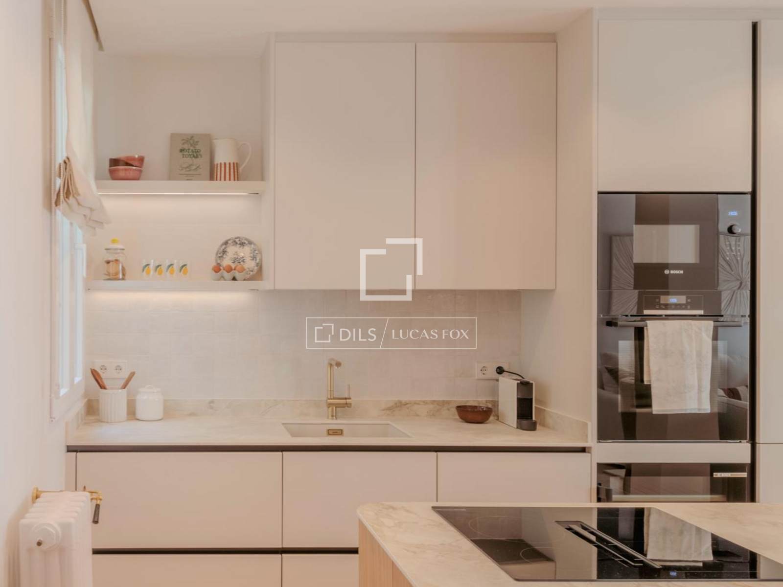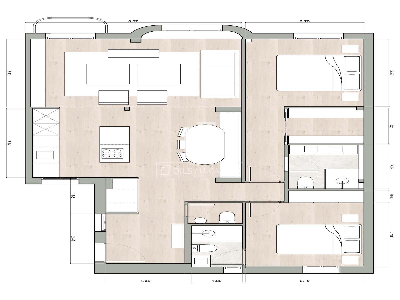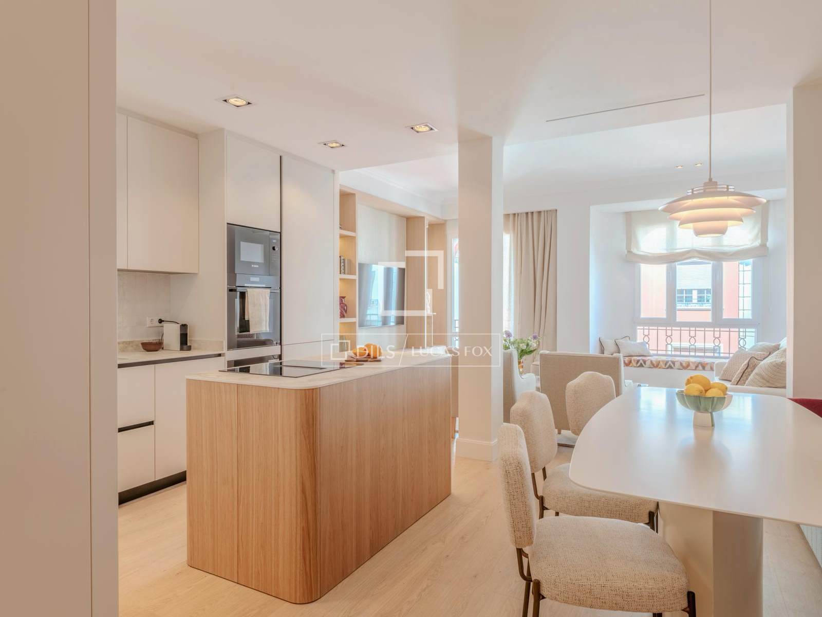 Bostaden är organiserad kring ett rymligt och ljust sällskapsutrymme, där vardagsrum, matsal och kök flyter sömlöst samman till ett balanserat och harmoniskt utrymme. Det specialdesignade köket integreras naturligt i den övergripande designen, vilket tillför både funktionalitet och estetik, och öppnar sig mot vardagsrummet, vilket skapar en idealisk miljö för både vardagsbruk och underhållning av gäster.