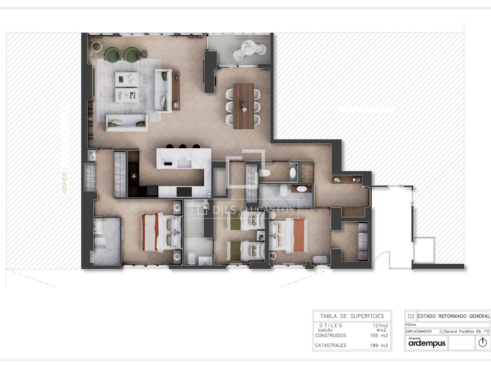 Lägenheten ligger på första våningen i en byggnad med hiss och concierge-service. Den har en ungefärlig yta på 189 m² och har utformats för att erbjuda rymlighet, komfort och funktionalitet.