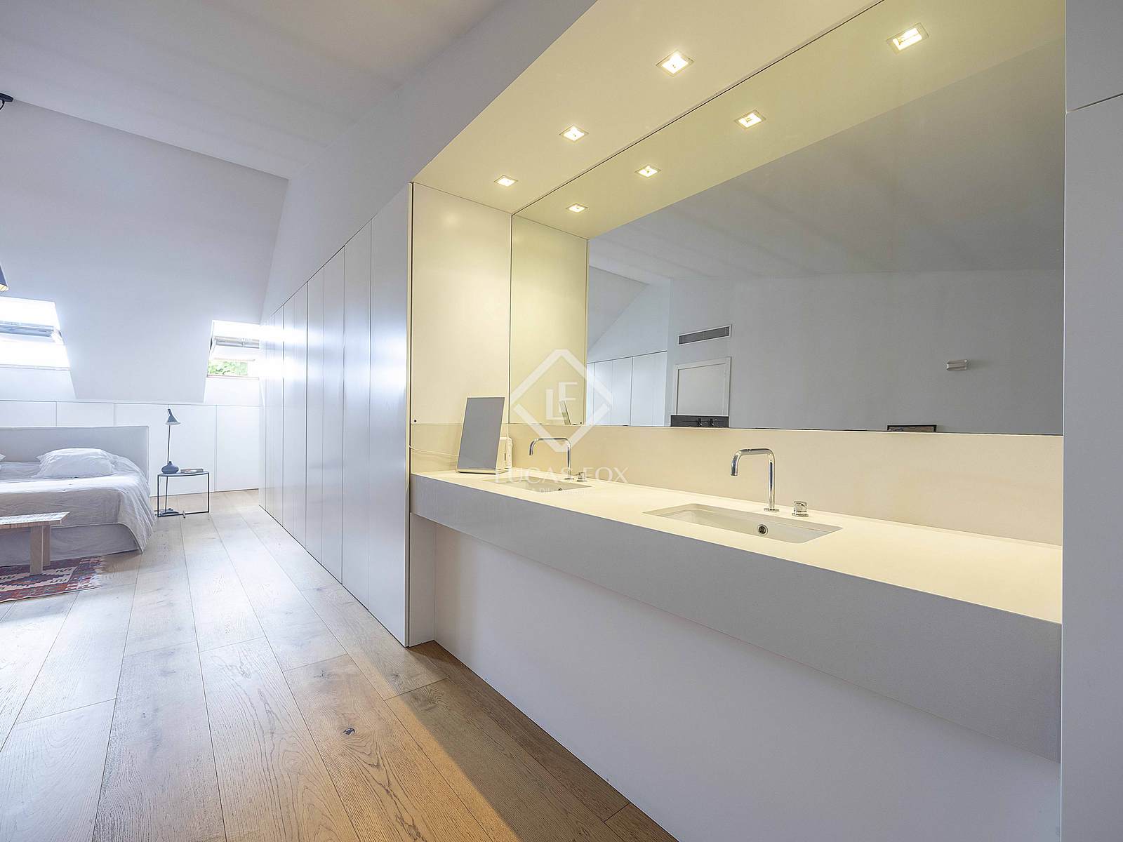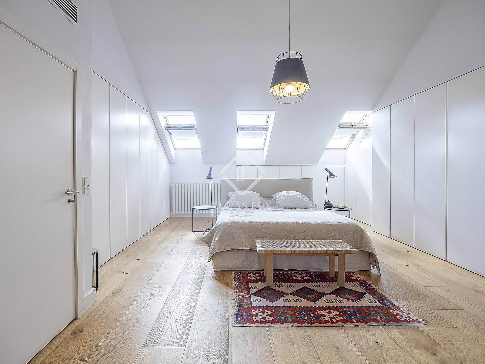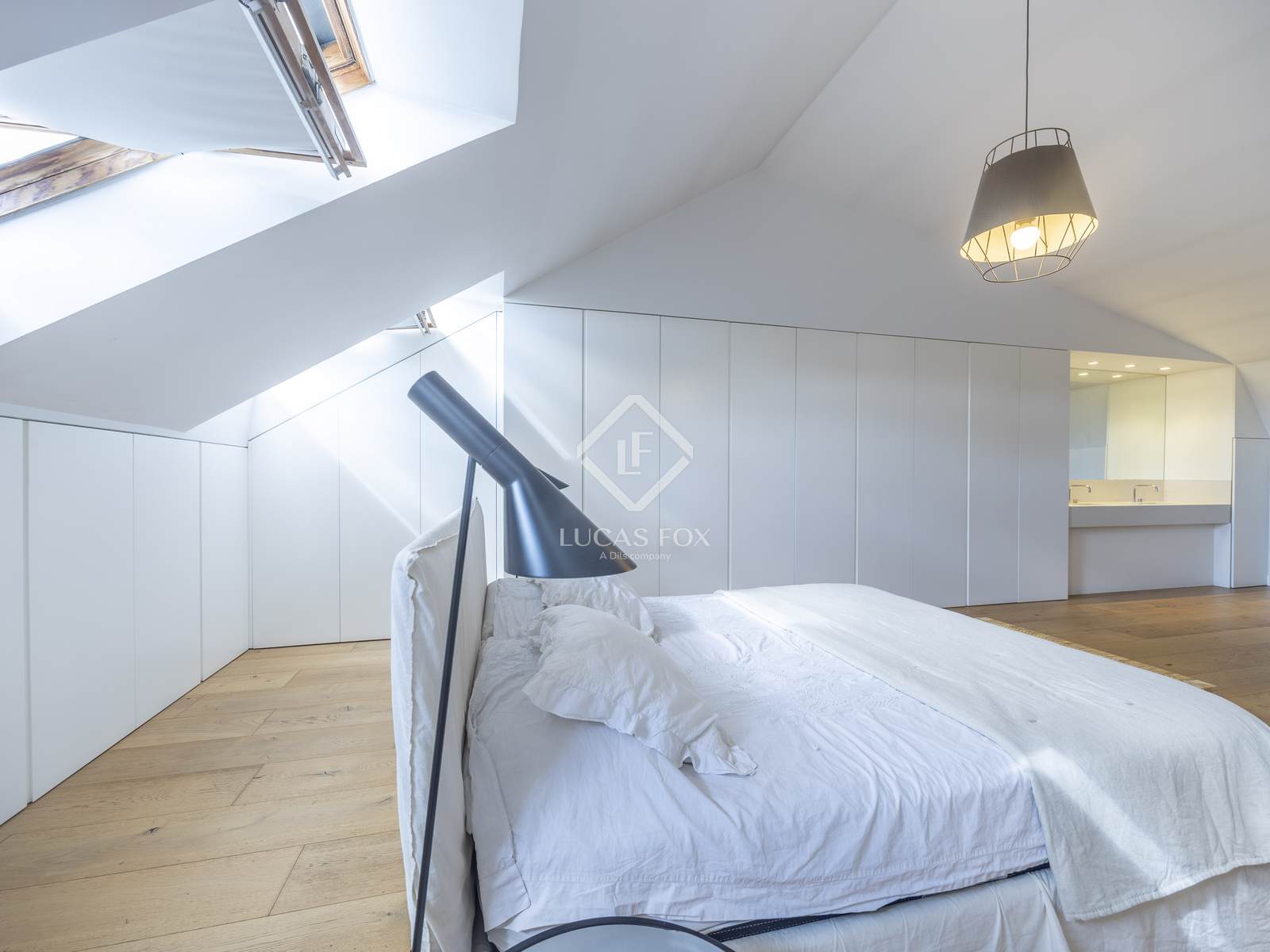När vi kommer in på vinden möts vi av det generöst tilltagna sovrummet, med högt i tak och gott om förvaringsutrymme tack vare sina många inbyggda garderober. Det har också ett stort ensuite-badrum med moderna linjer, ett fristående badkar och en stor duschkabin.