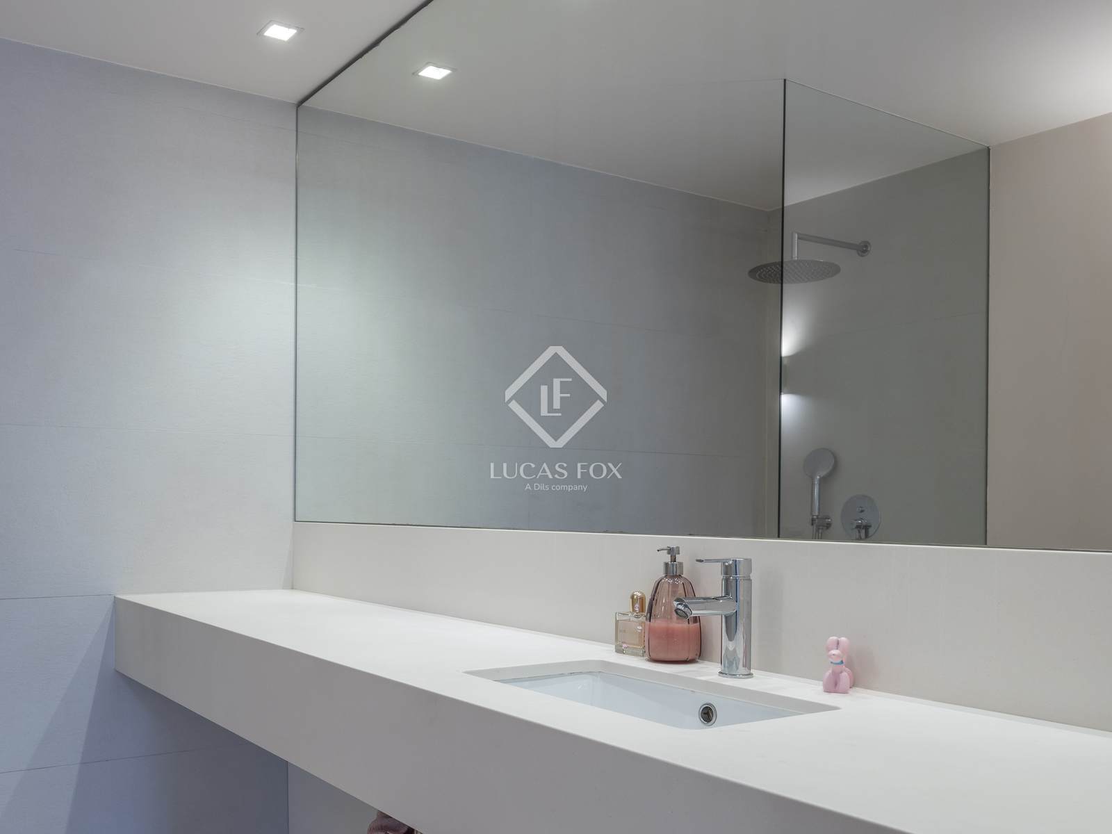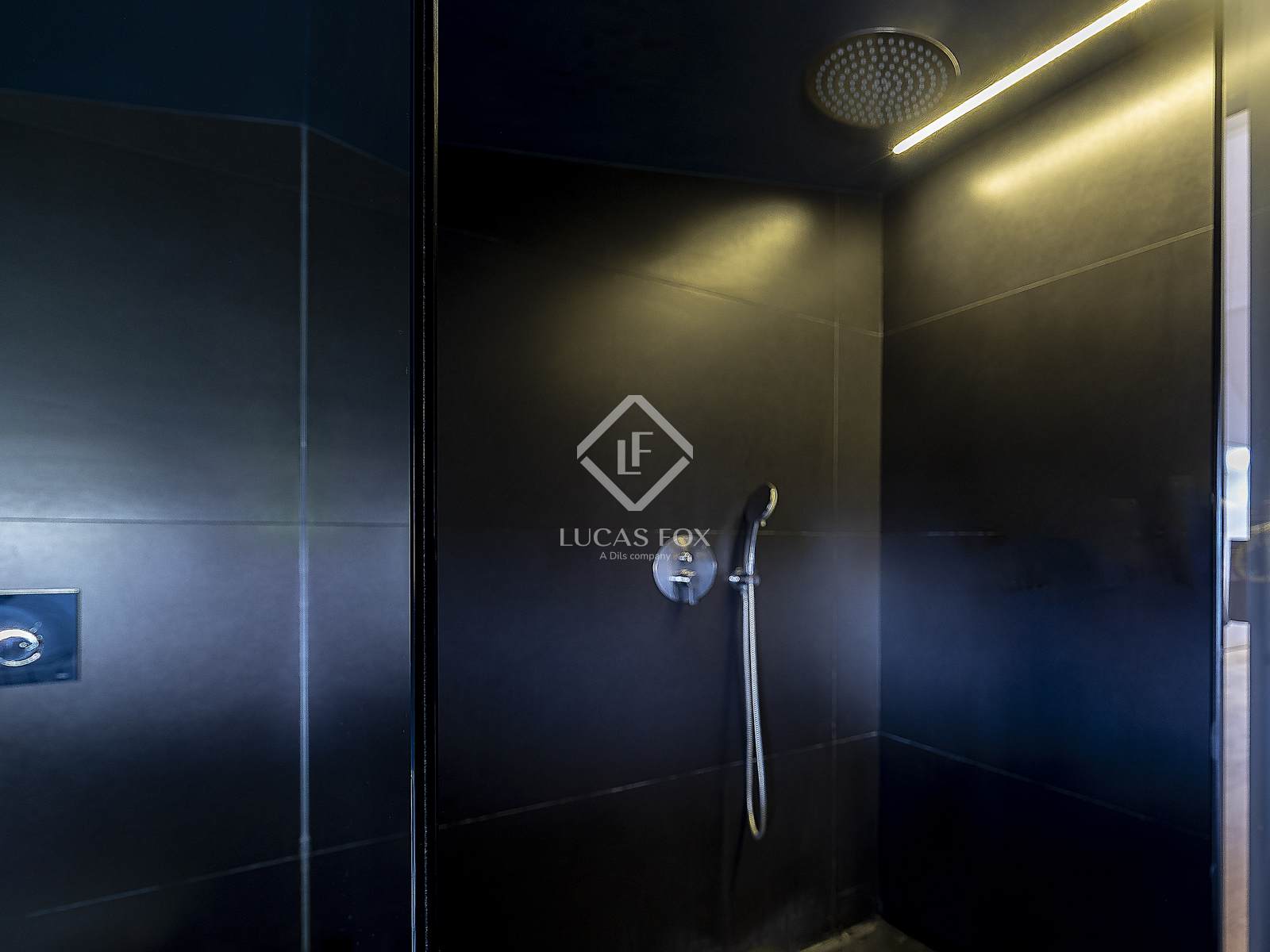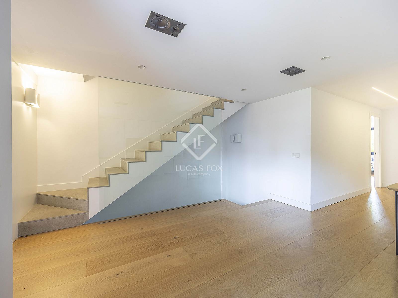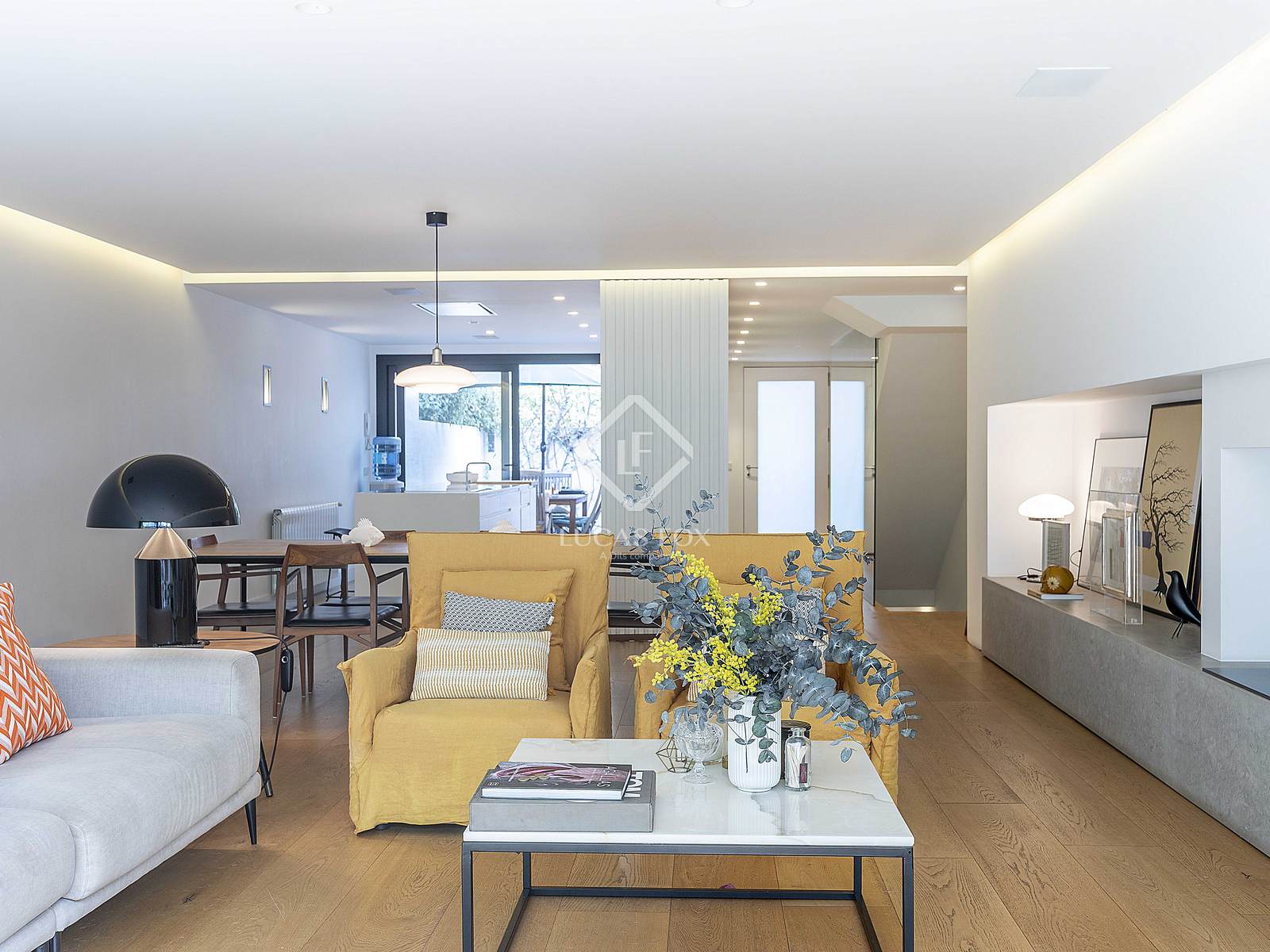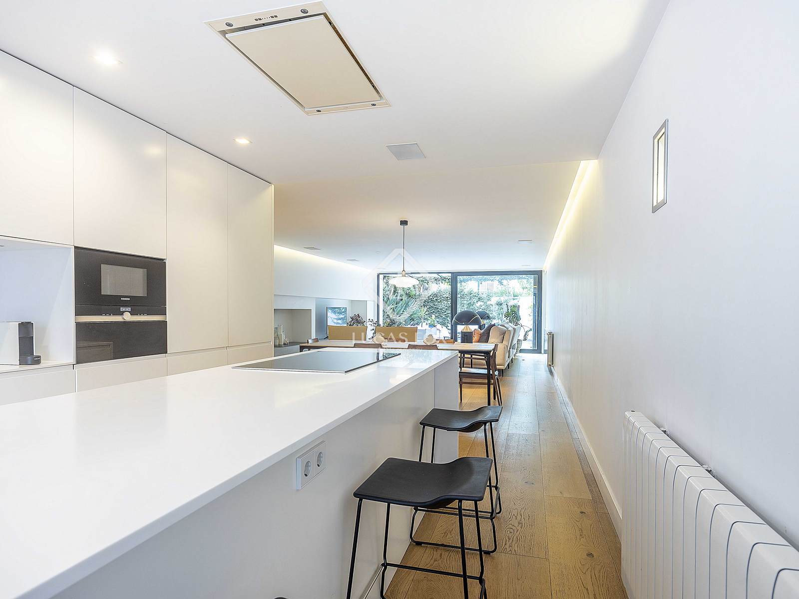 På bottenvåningen leder en elegant entréhall till ett rymligt och ljust vardagsrum/matsal, utformat som det centrala utrymmet för familjelivet. Dess stora fönster släpper in rikligt med naturligt ljus och öppnar upp mot en mysig privat terrass, perfekt för att njuta av kvällar utomhus. Bredvid detta ligger det moderna öppna köket, med minimalistiska linjer och utrustat med högkvalitativa vitvaror. Köket öppnar bekvämt upp mot en annan terrass, perfekt för frukost eller informella måltider utomhus. Den har en stor central köksö och gott om förvaringsutrymme.
