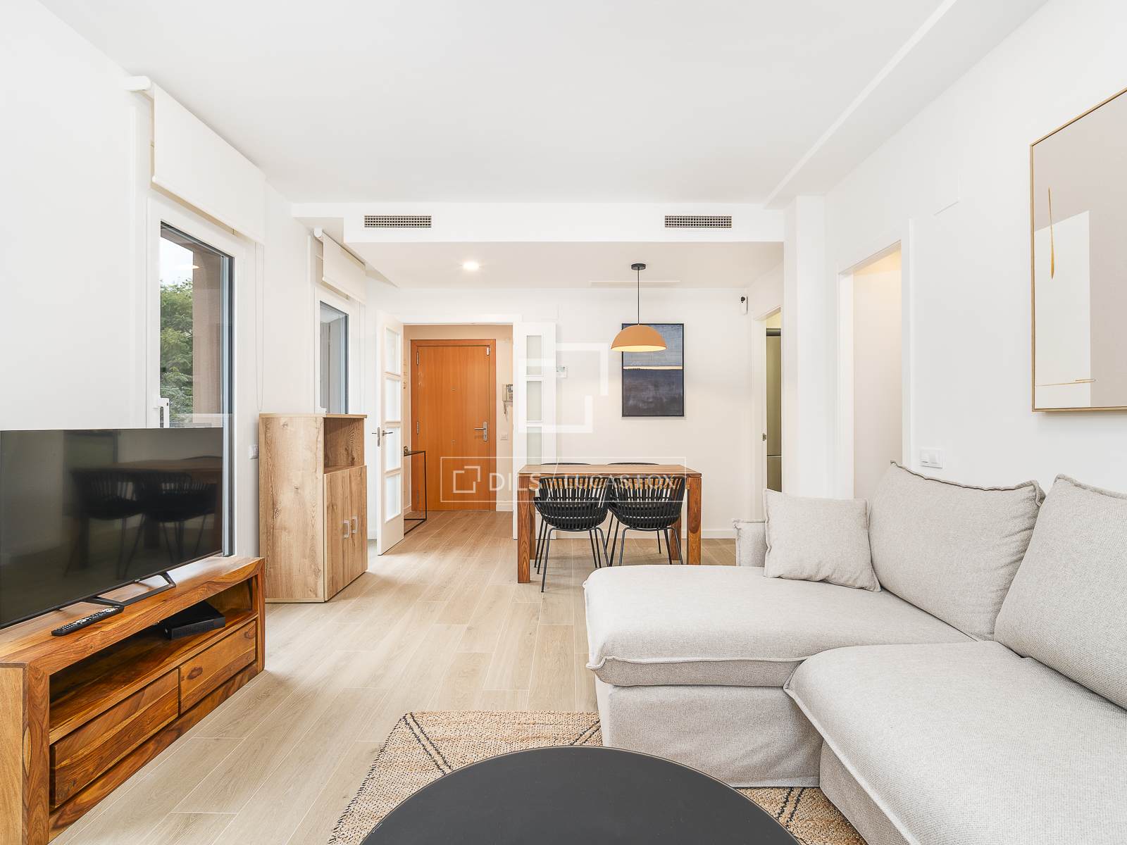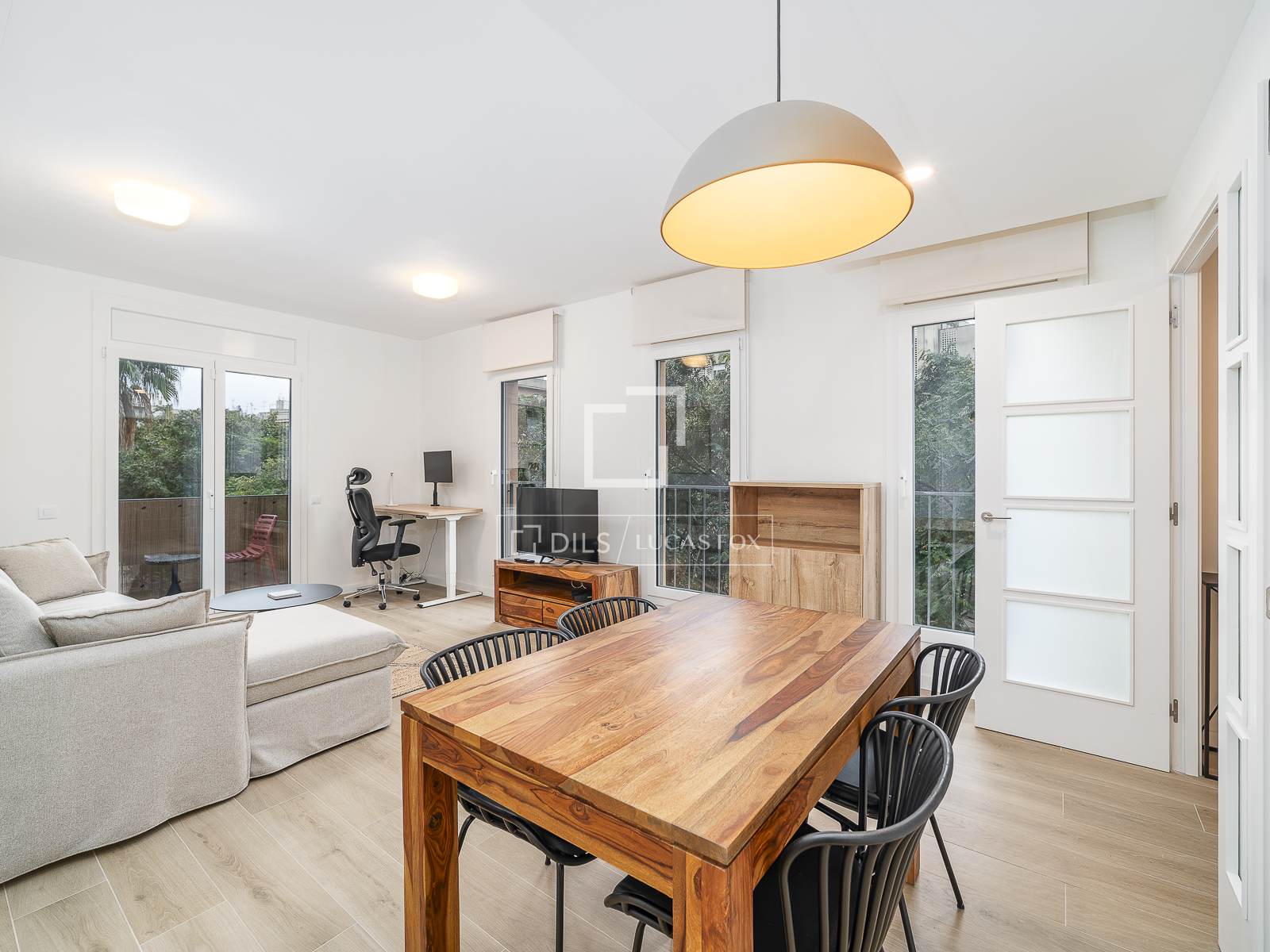 Vardagsrummet med matplats öppnar sig mot vardagsrummet, ett ljust och luftigt utrymme som njuter av rikligt naturligt ljus tack vare balkonger med utsikt över parken. Det är möblerat med en bekväm soffa, en TV och ett skrivbord, perfekt för att arbeta hemifrån eller studera.
