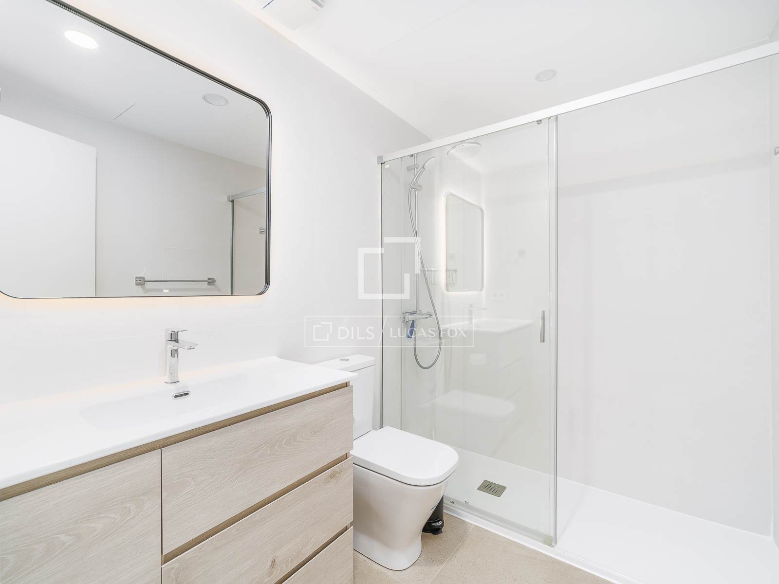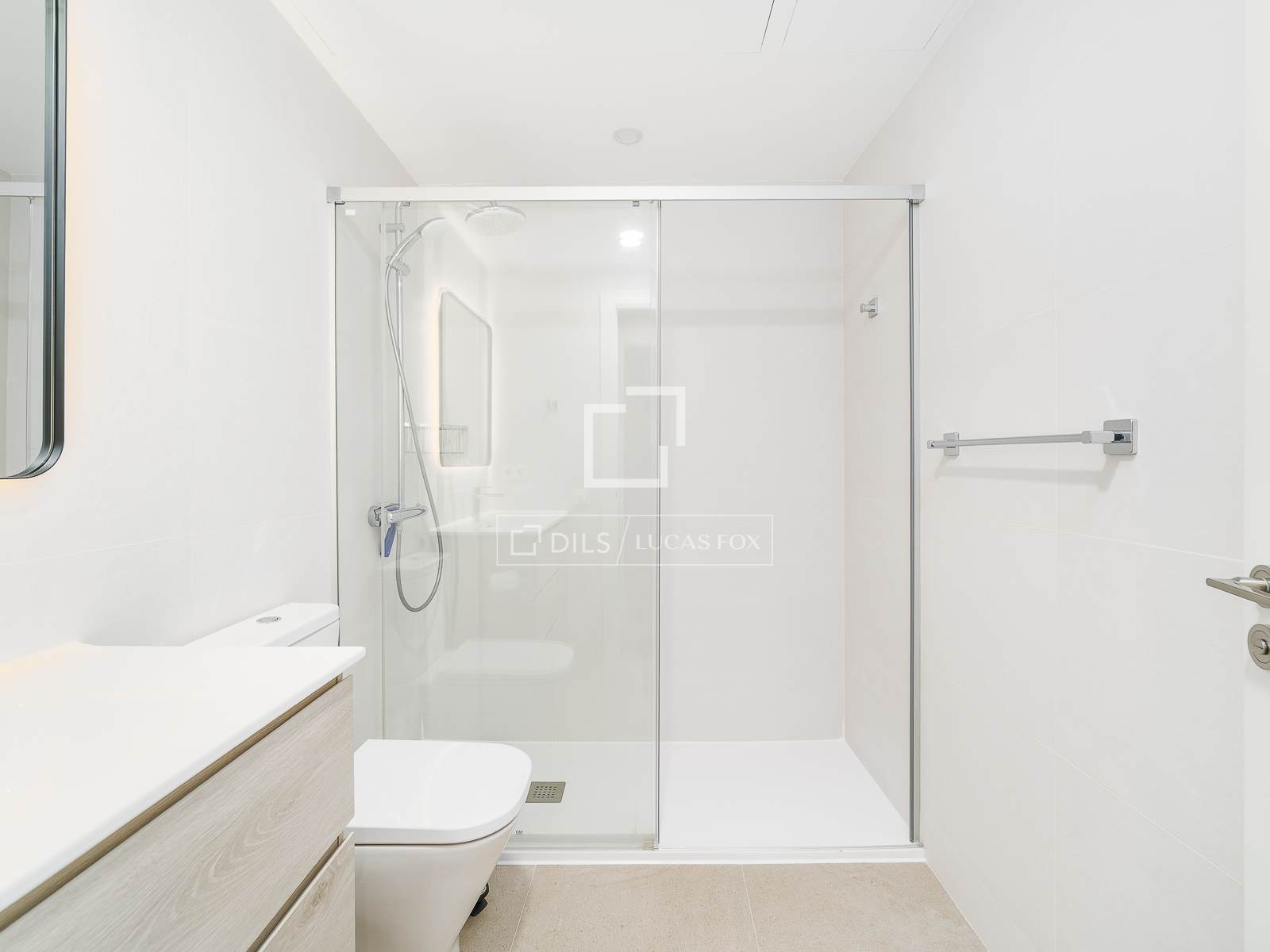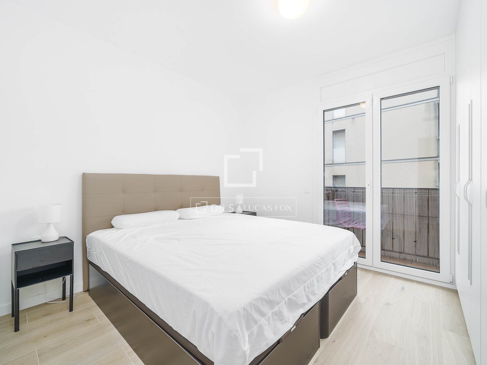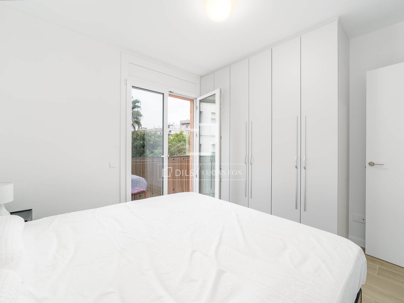 Sovdelen erbjuder ett praktiskt förvaringsskåp med tvättmaskin, ett komplett badrum med dusch och ett sovrum med dubbelsäng, stora inbyggda garderober och tillgång till en balkong, vilket ger naturligt ljus och ventilation.