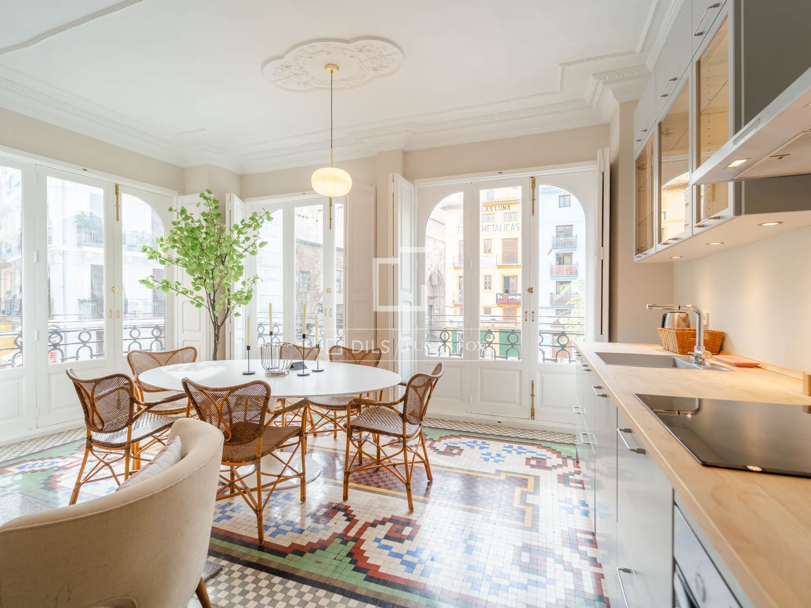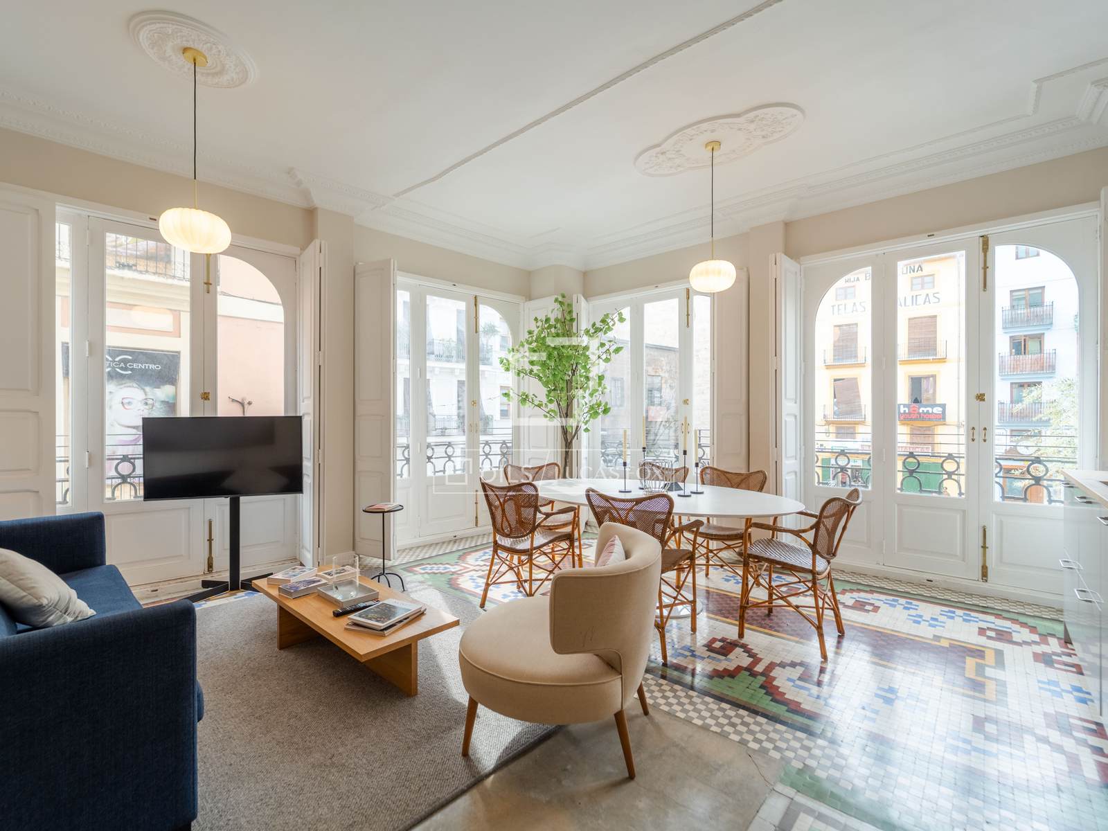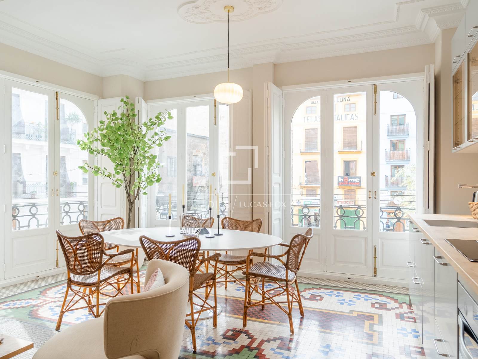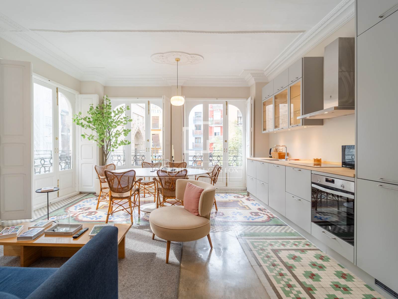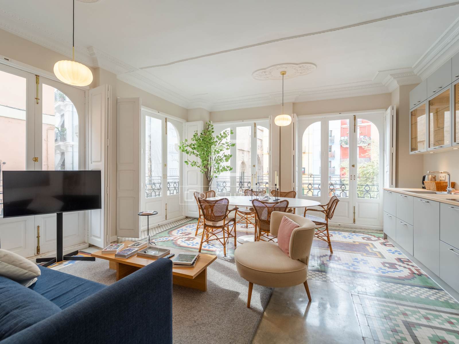 Denna exklusiva lägenhet på 100 m², belägen i hjärtat av Mercat-distriktet i Ciutat Vella, erbjuder en perfekt blandning av historisk charm och modern komfort. Fastigheten har totalrenoverats, men dess ursprungliga karaktär har bevarats, och dess unika arkitektoniska detaljer, såsom de restaurerade hydrauliska mosaikgolven och höga taken, har framhävts, vilket skapar en rymlig och elegant atmosfär.
