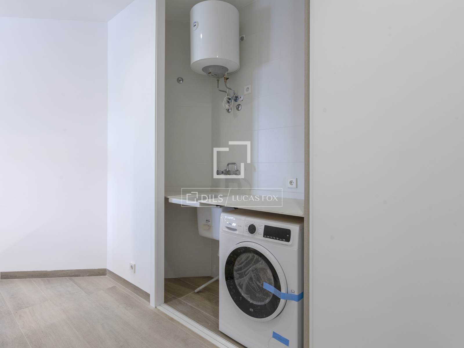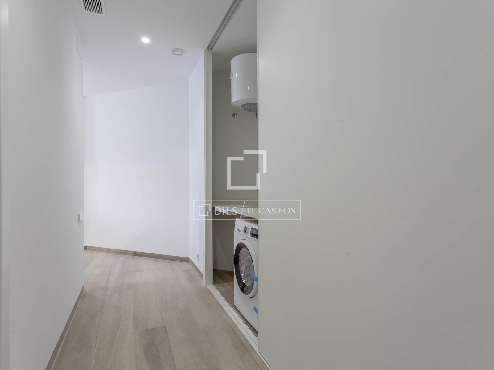Bostaden har ett teknikutrymme integrerat i hallen med tvättmaskin och torktumlare.