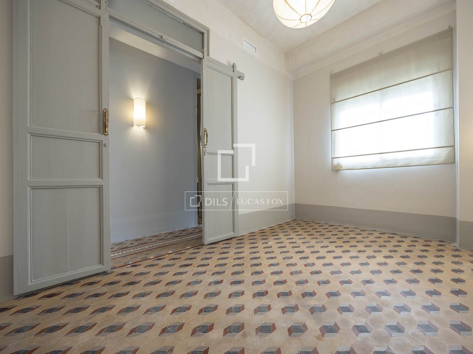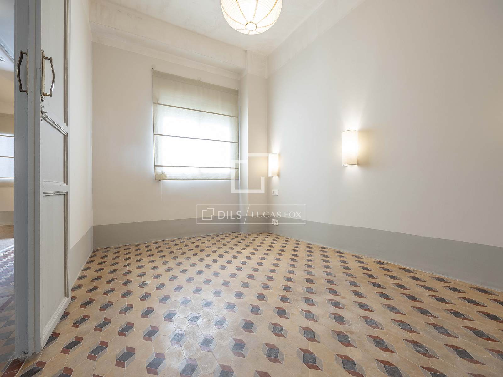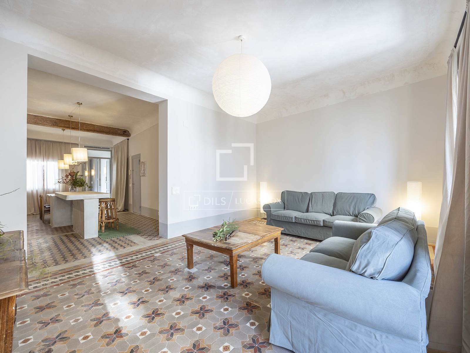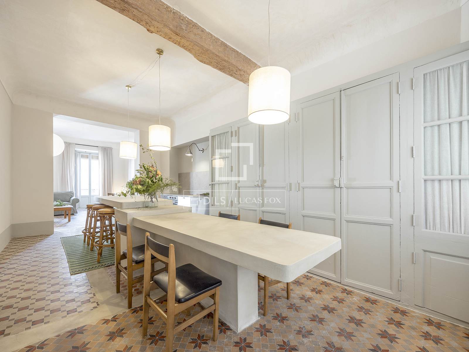 Det 3,30 meter höga taket ger rummet rymlighet, medan kombinationen av de ursprungliga Nolla-golven med hydrauliska klinkers erbjuder en perfekt atmosfär av avskildhet och integritet i hela hemmet.
