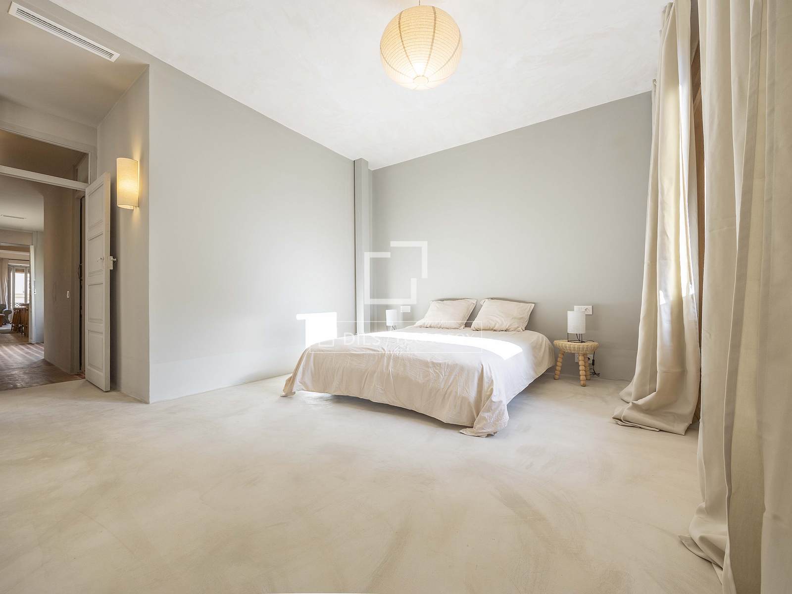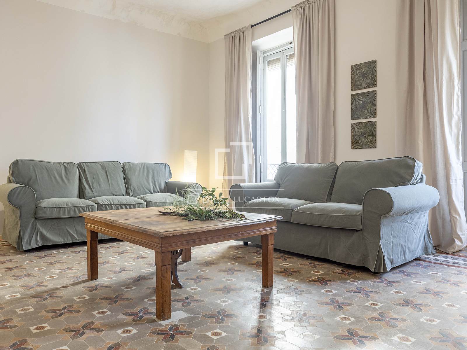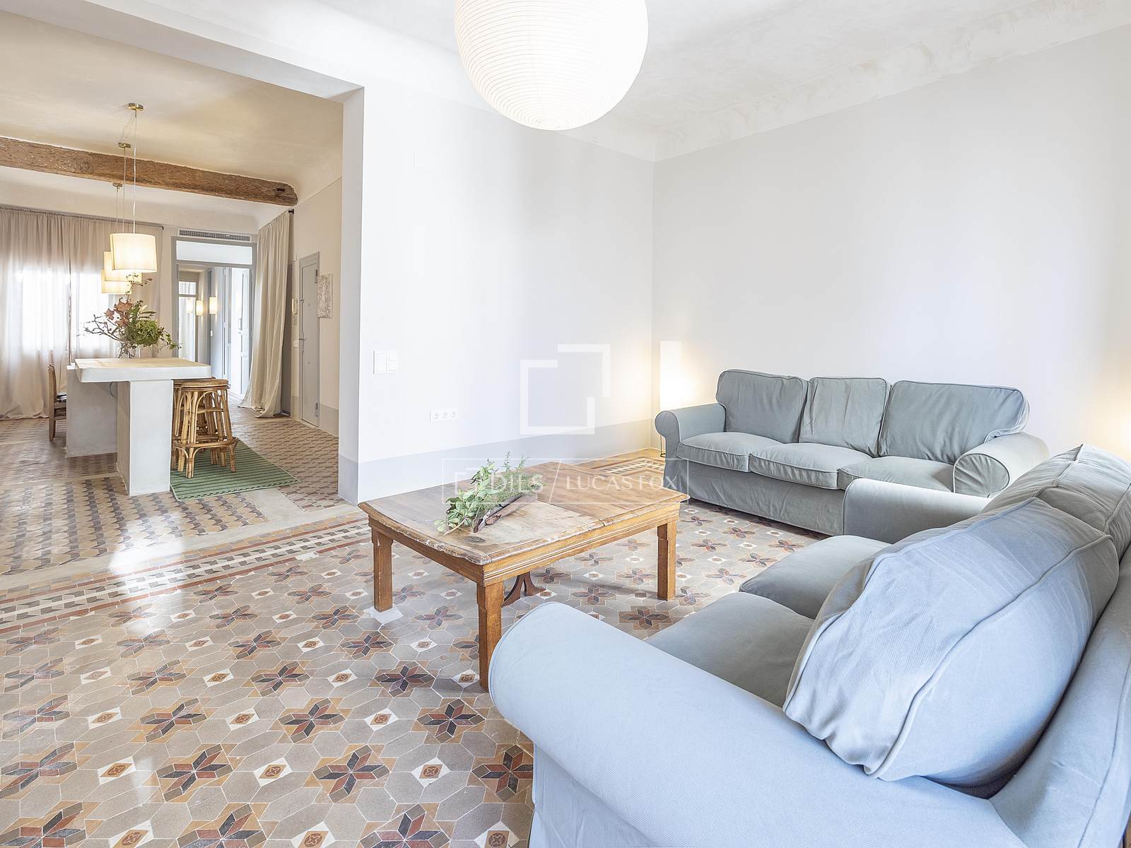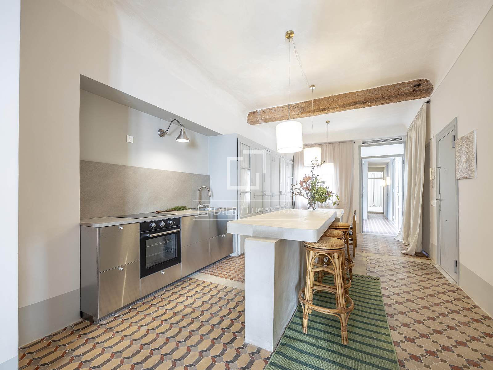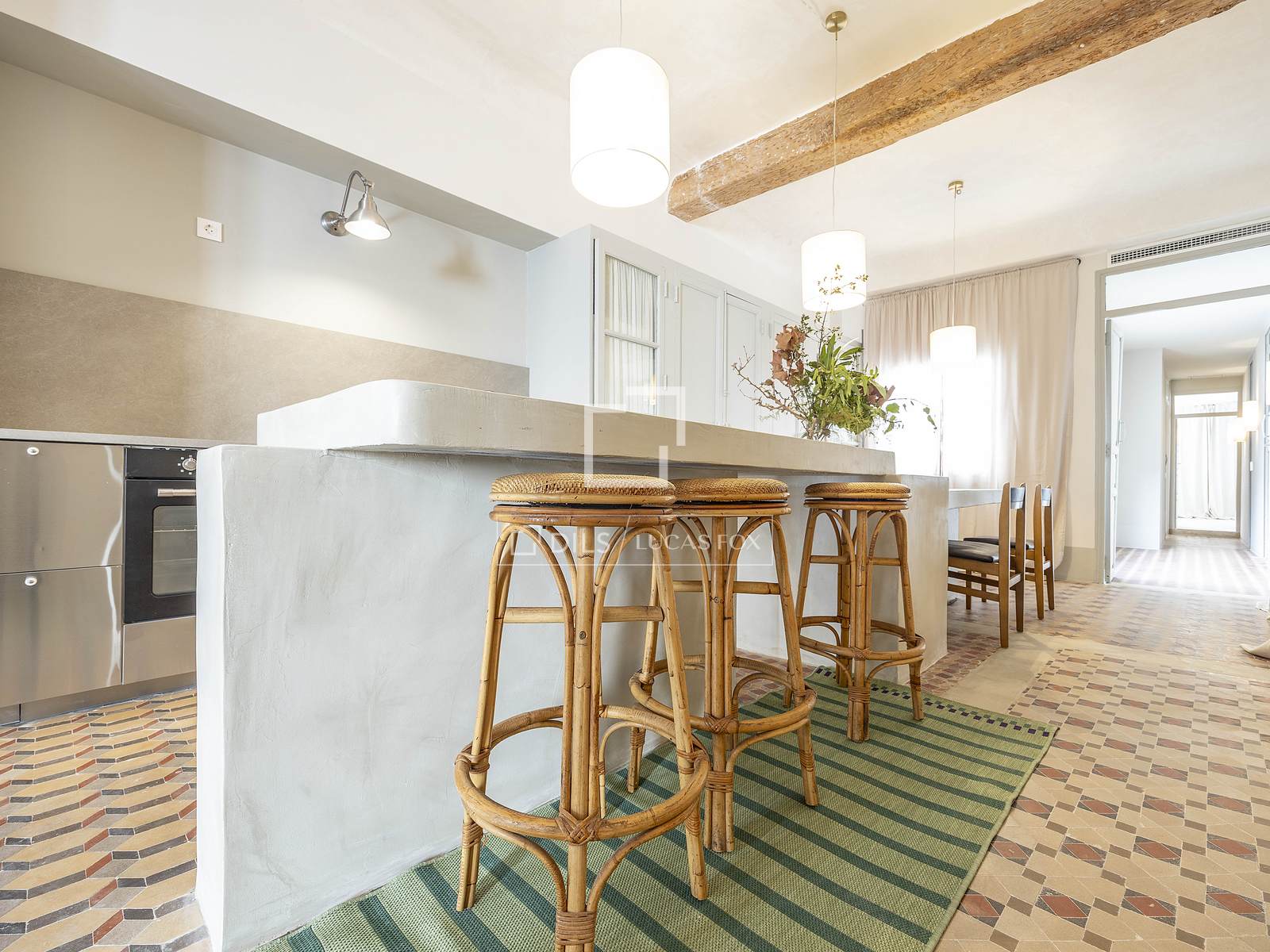 Det 3,30 meter höga taket ger rummet rymlighet, medan kombinationen av de ursprungliga Nolla-golven med hydrauliska klinkers erbjuder en perfekt atmosfär av avskildhet och integritet i hela hemmet.