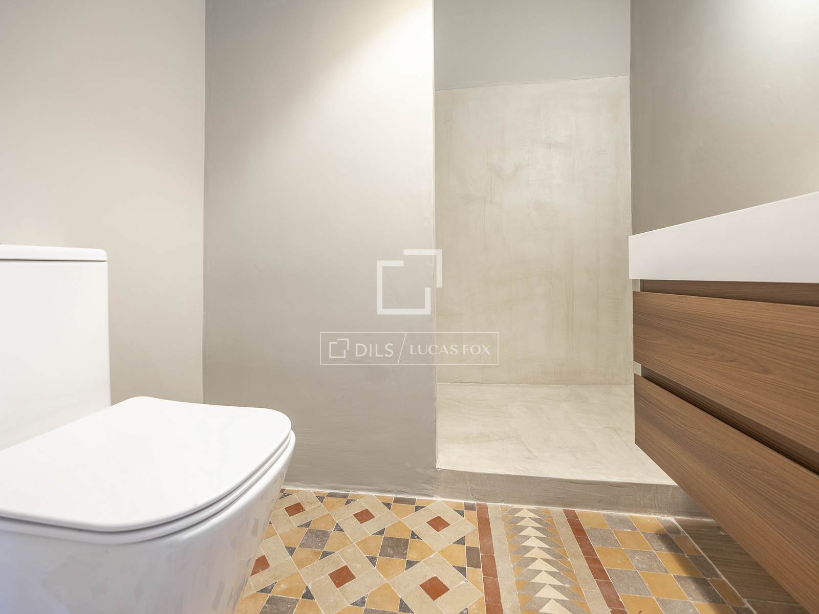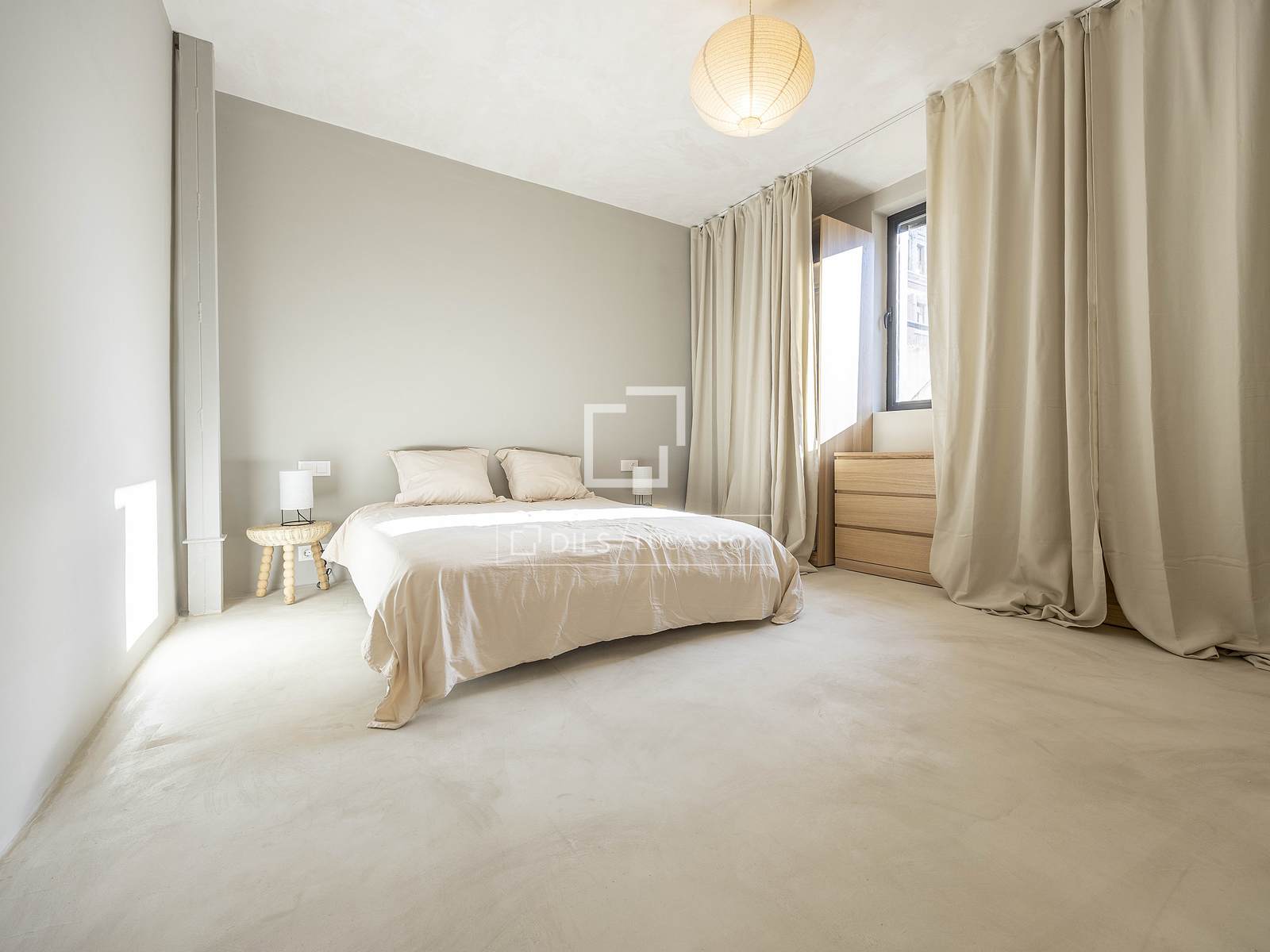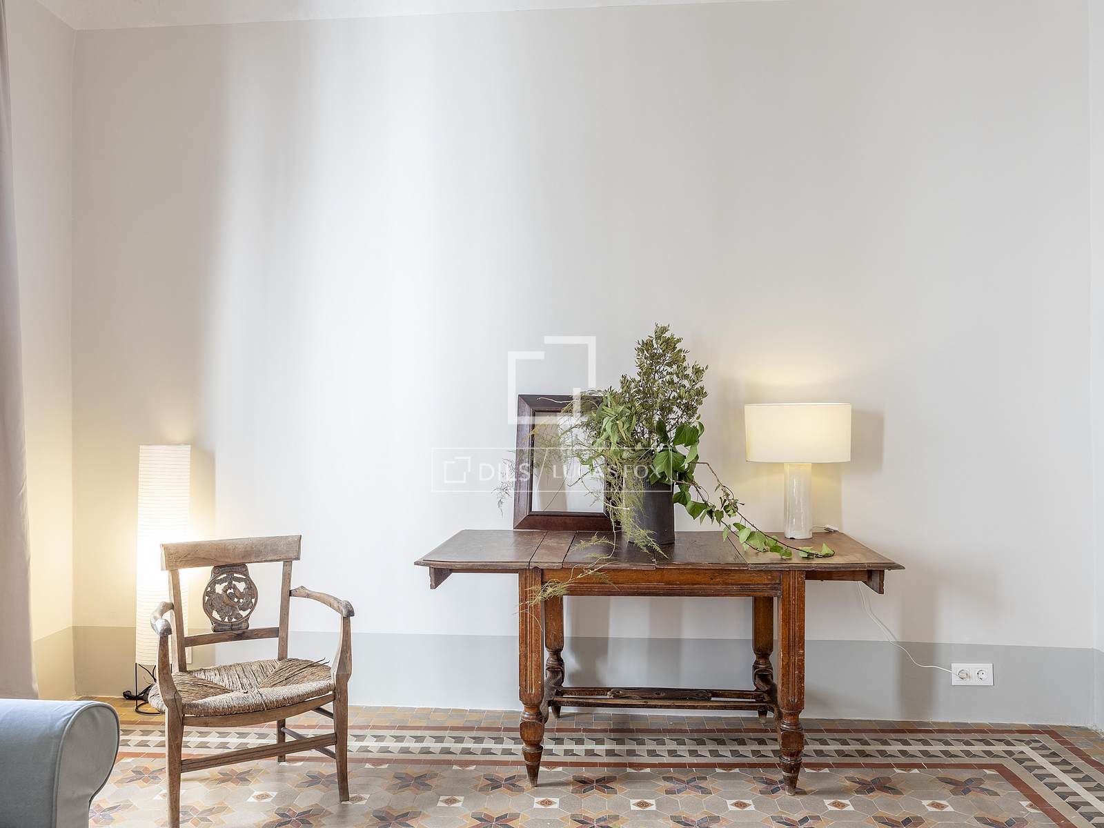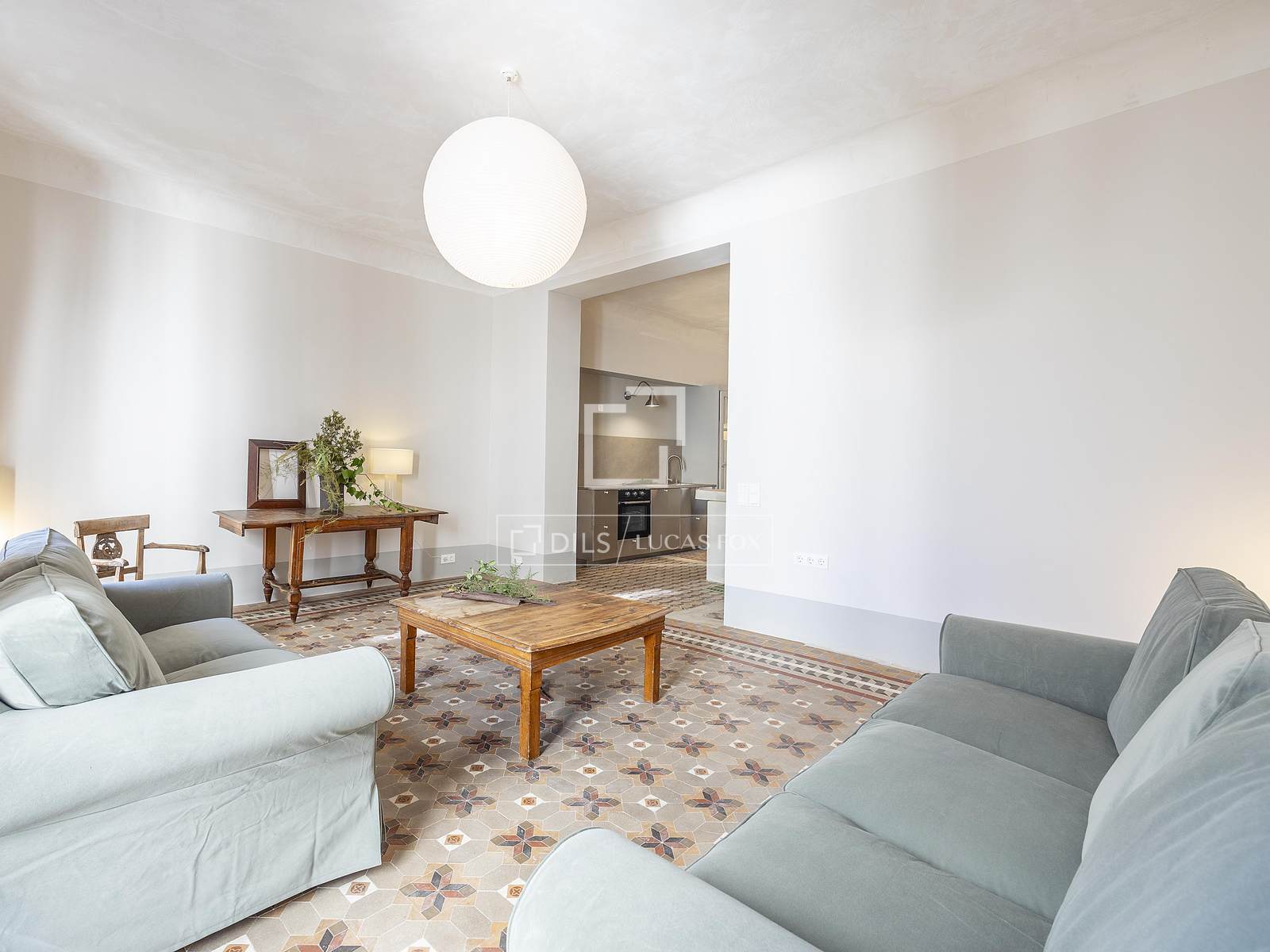 Det 3,30 meter höga taket ger rummet rymlighet, medan kombinationen av de ursprungliga Nolla-golven med hydrauliska klinkers erbjuder en perfekt atmosfär av avskildhet och integritet i hela hemmet.