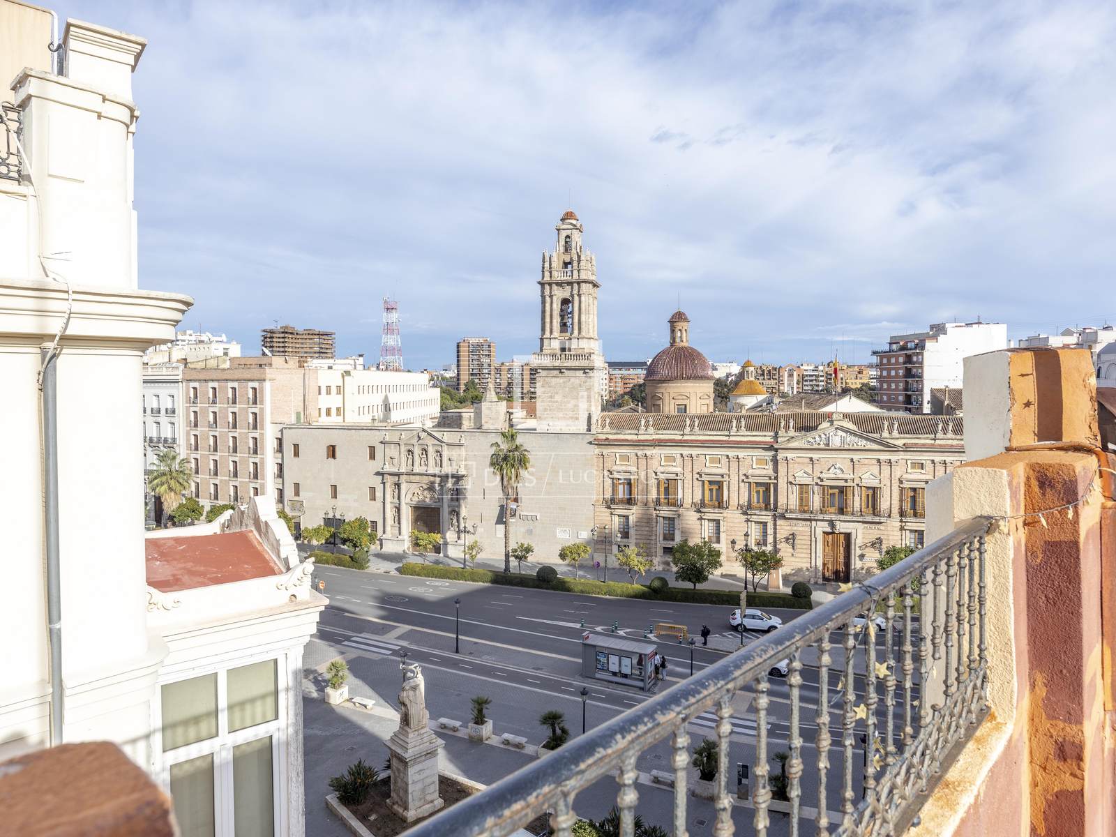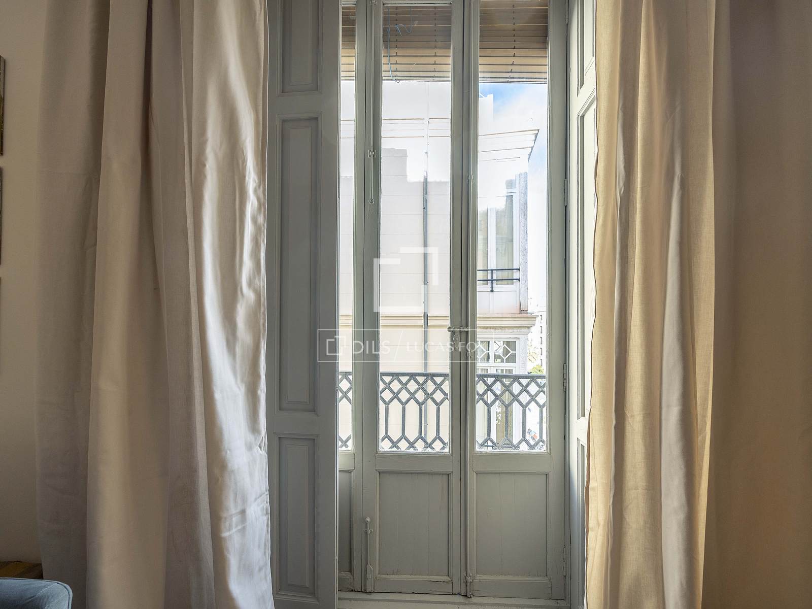 Utsidan av det huvudsakliga vardagsrummet och matsalen kommer från dessa fönster bredvid fasaden och två eleganta balkonger med utsikt över staden.